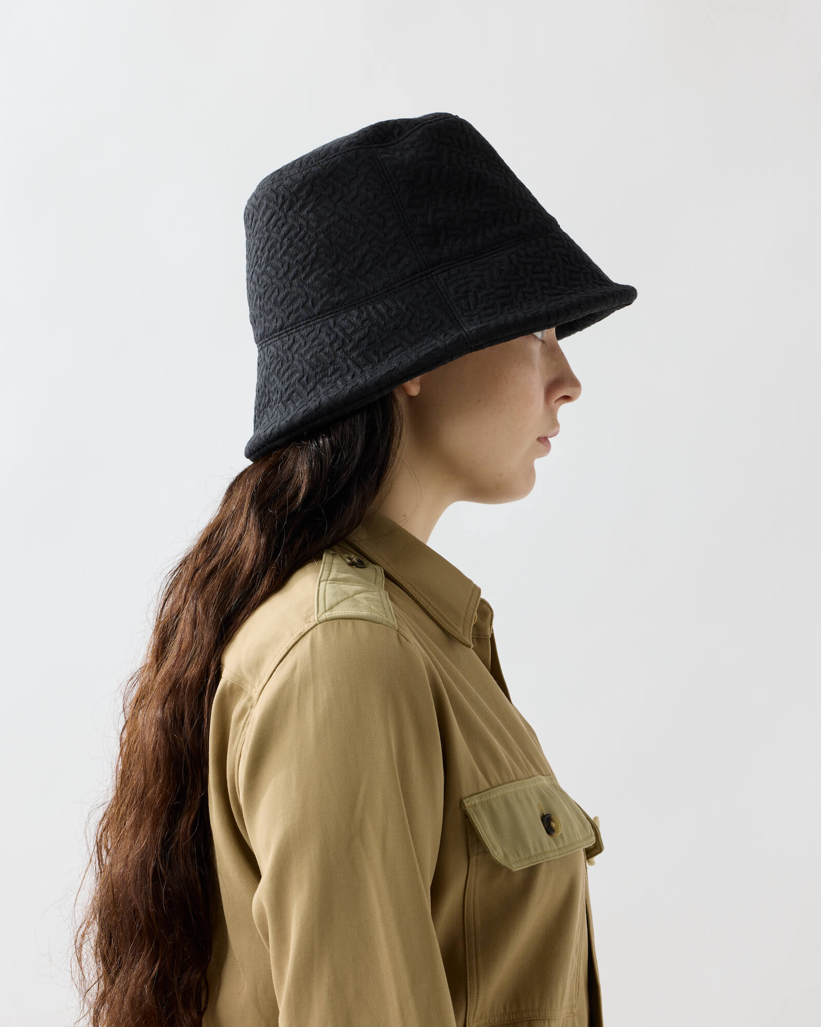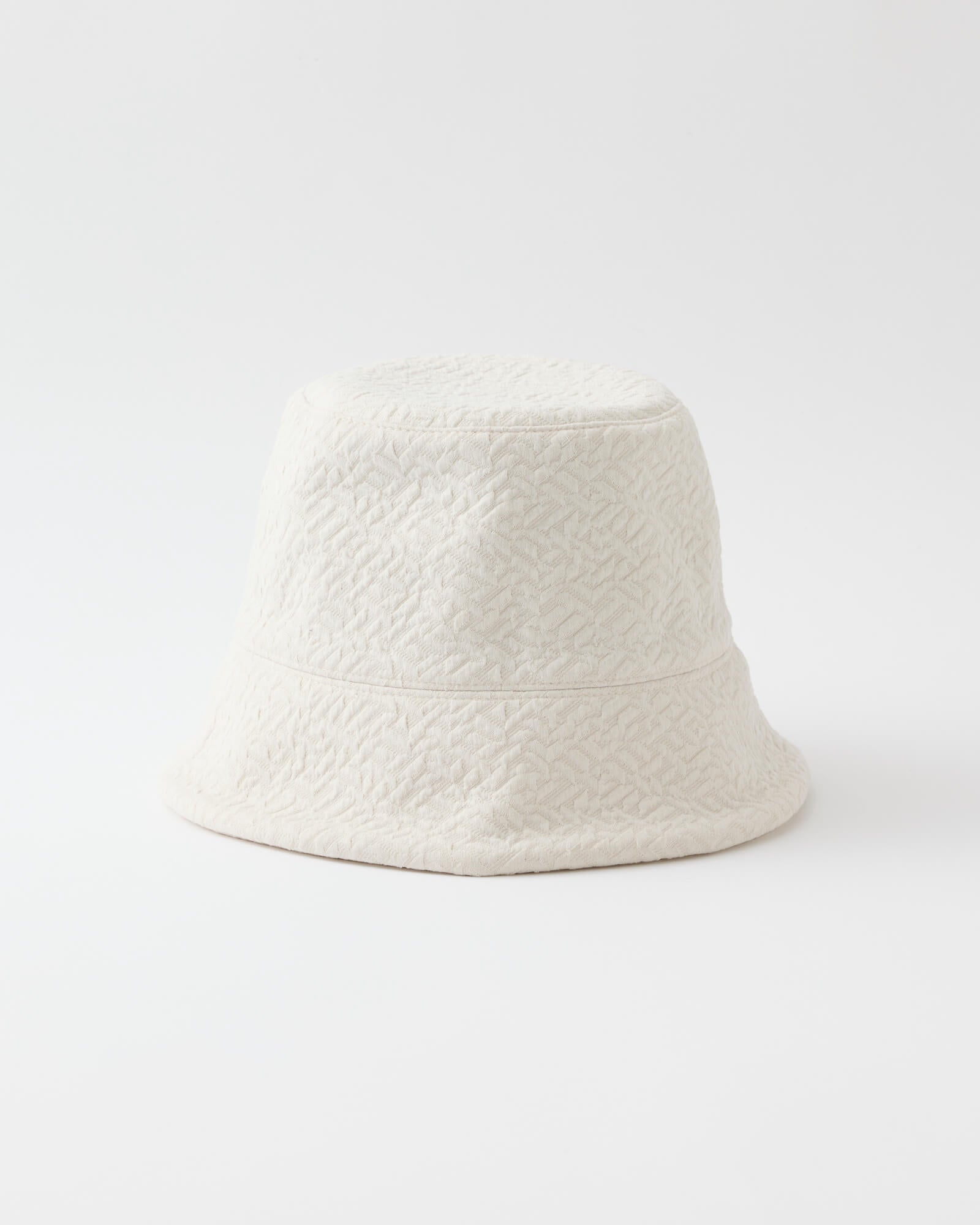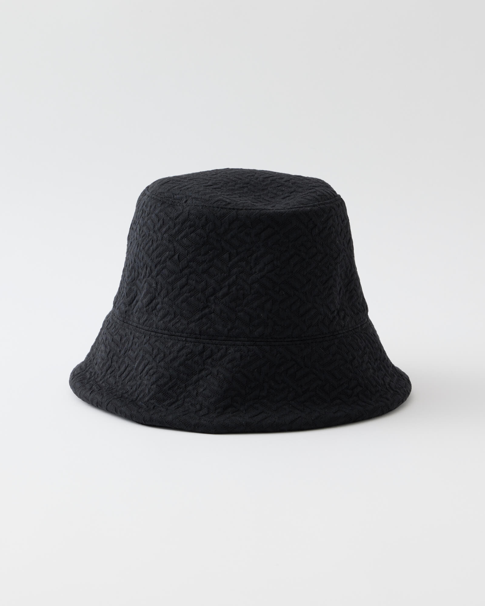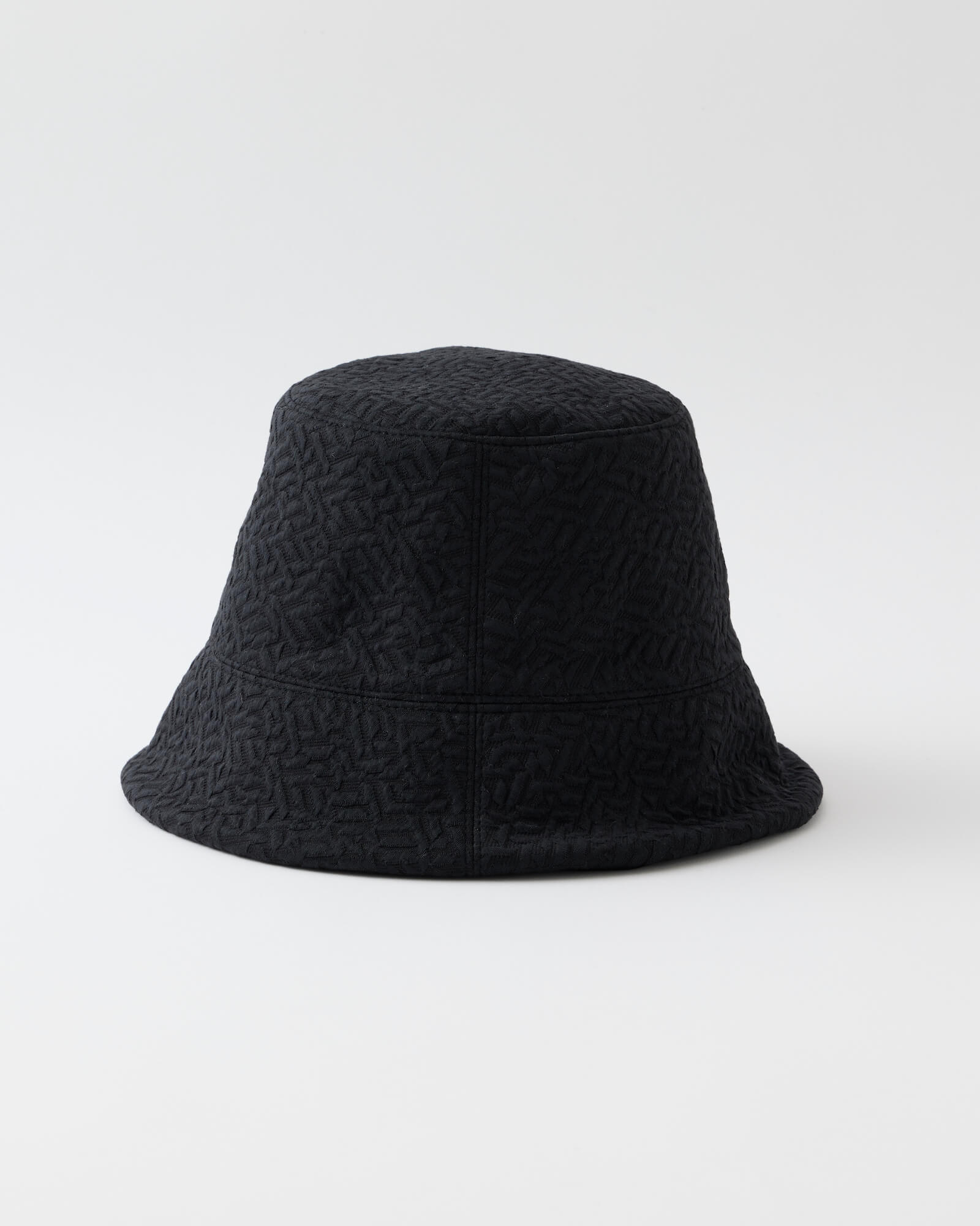 A bucket hat featuring a sharply angled brim that creates a bold, sculptural silhouette.