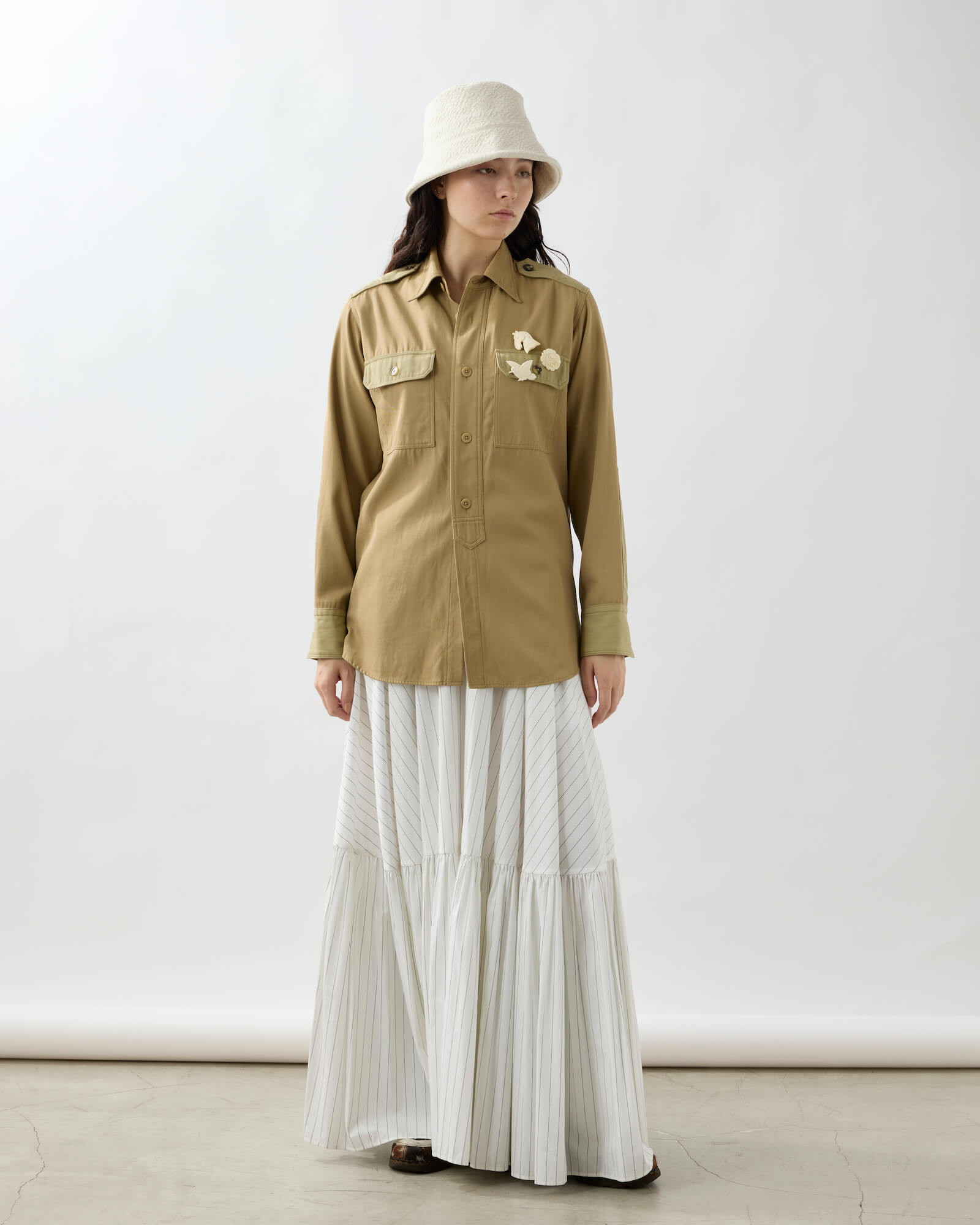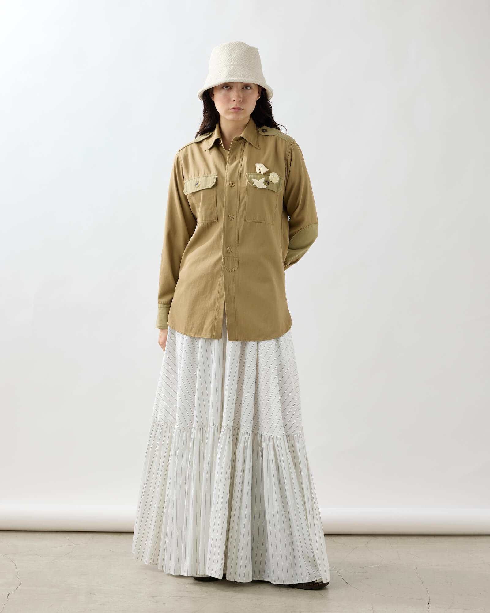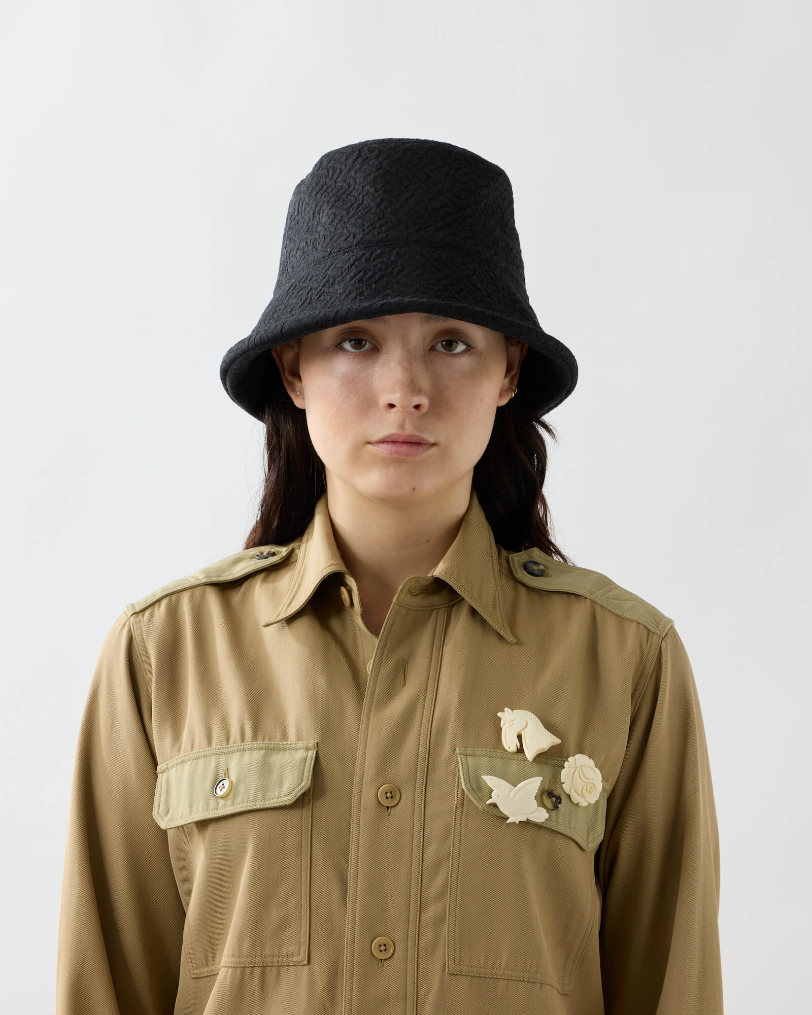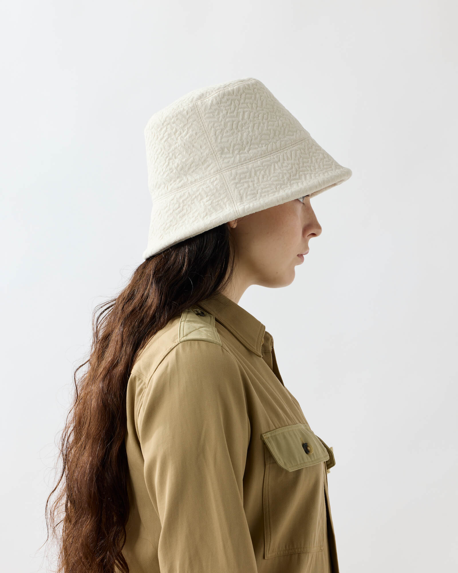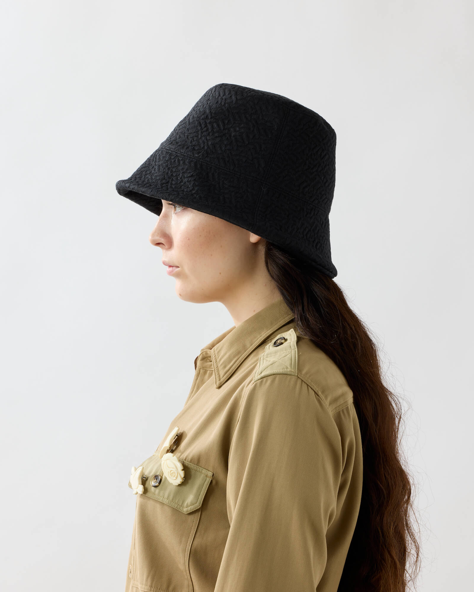 A bucket hat featuring a sharply angled brim that creates a bold, sculptural silhouette.