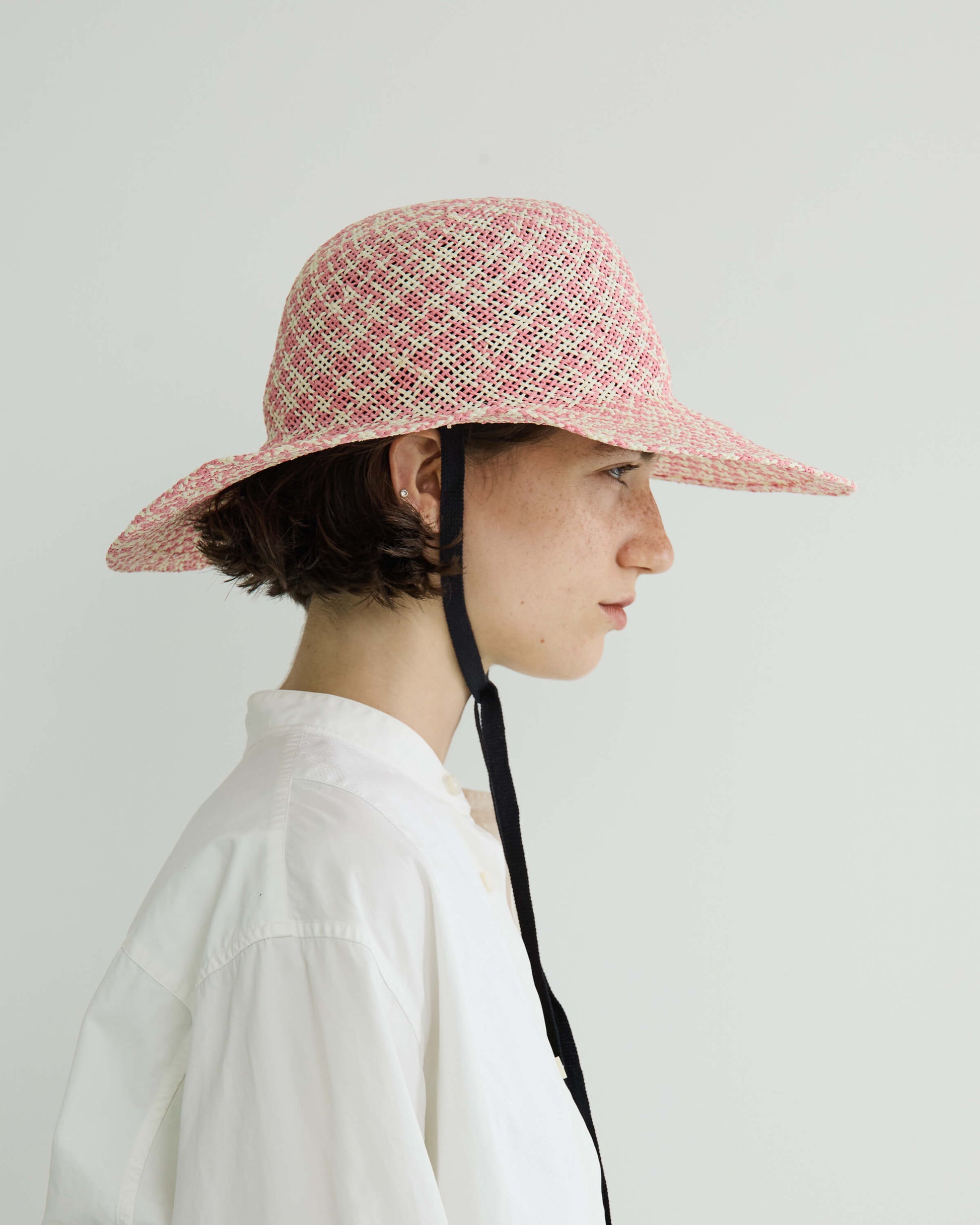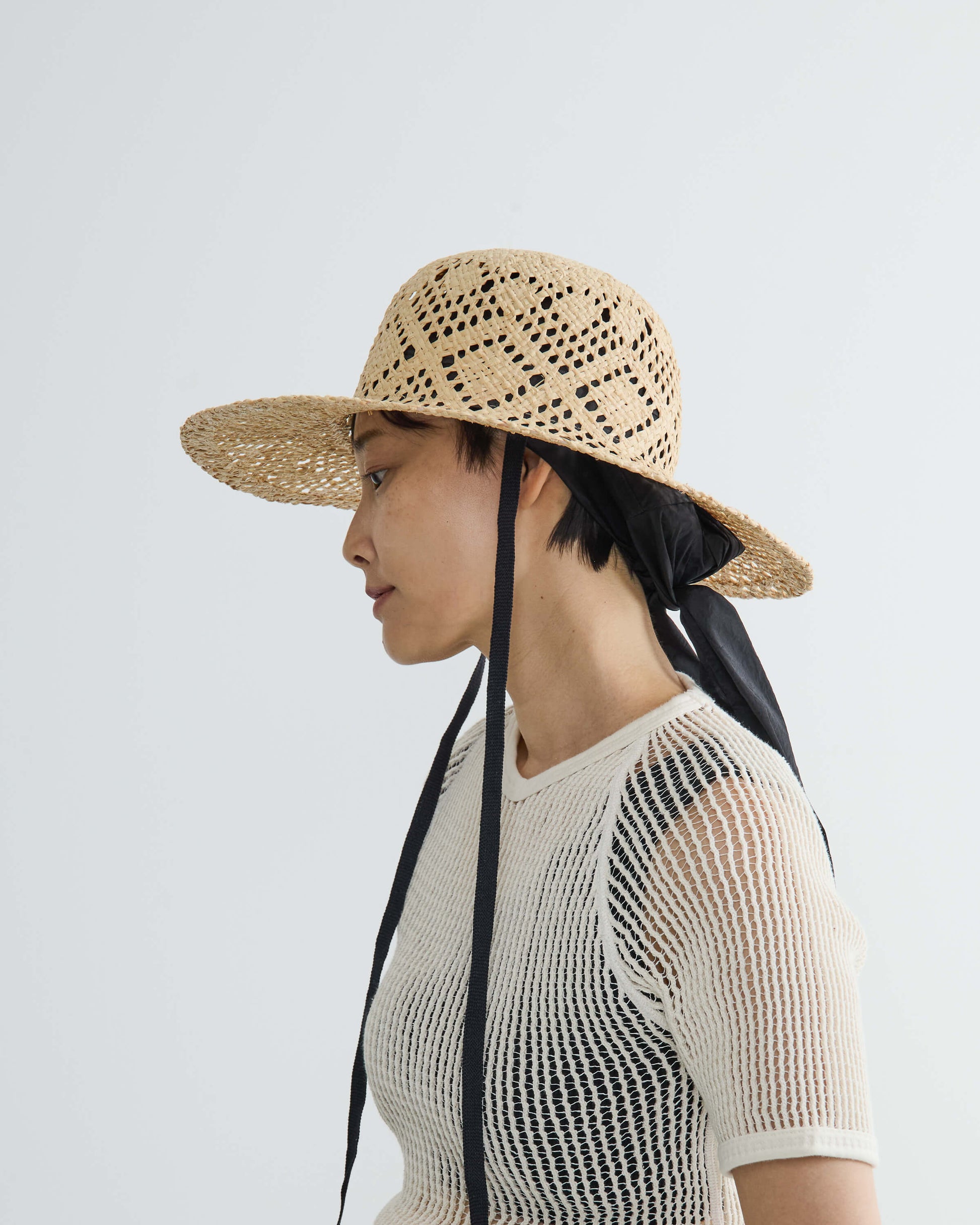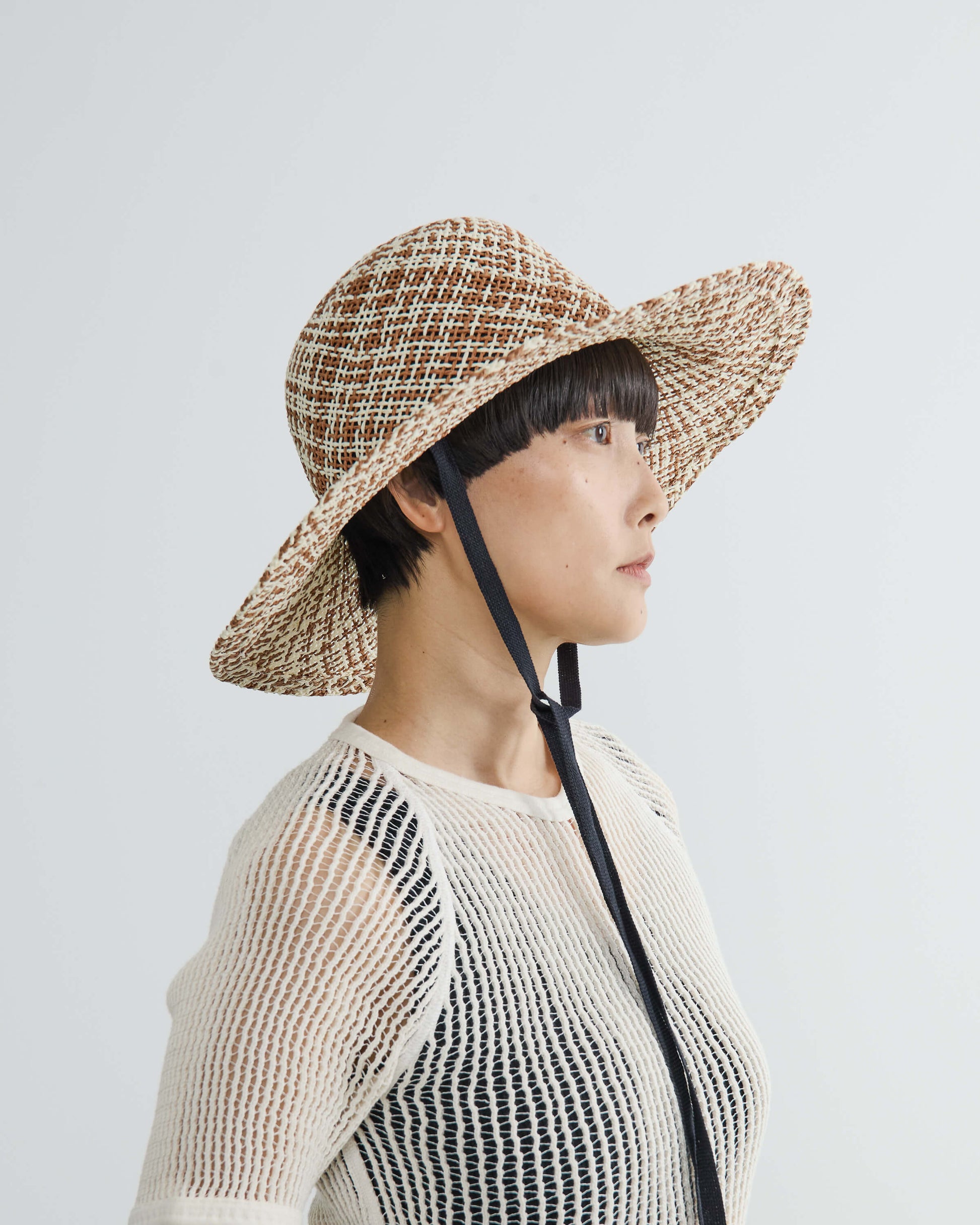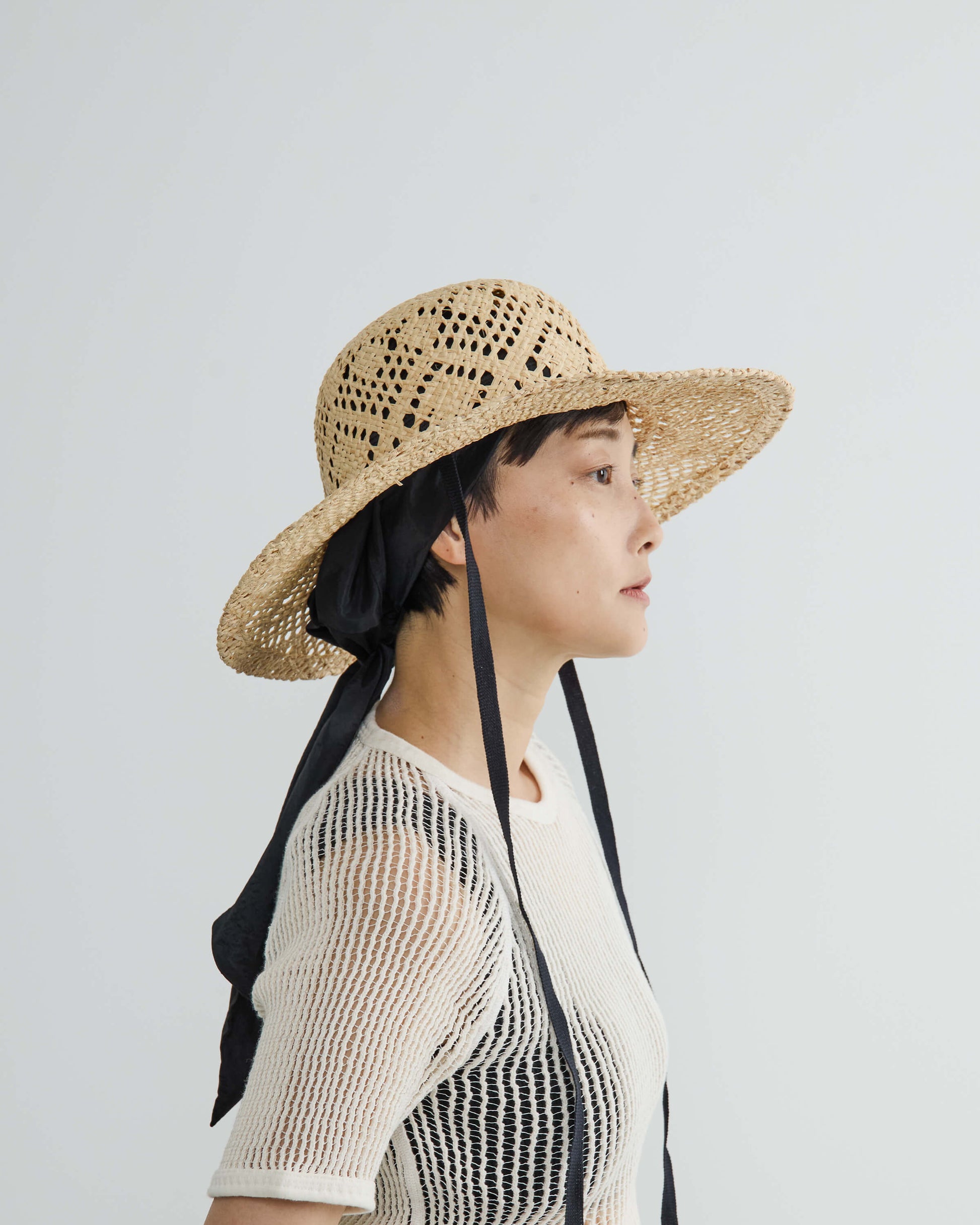 ブリムの長さとクラウンのバランスにこだわり、大げさにならない絶妙なボリューム感にまとめてリボン付きでポイントに。