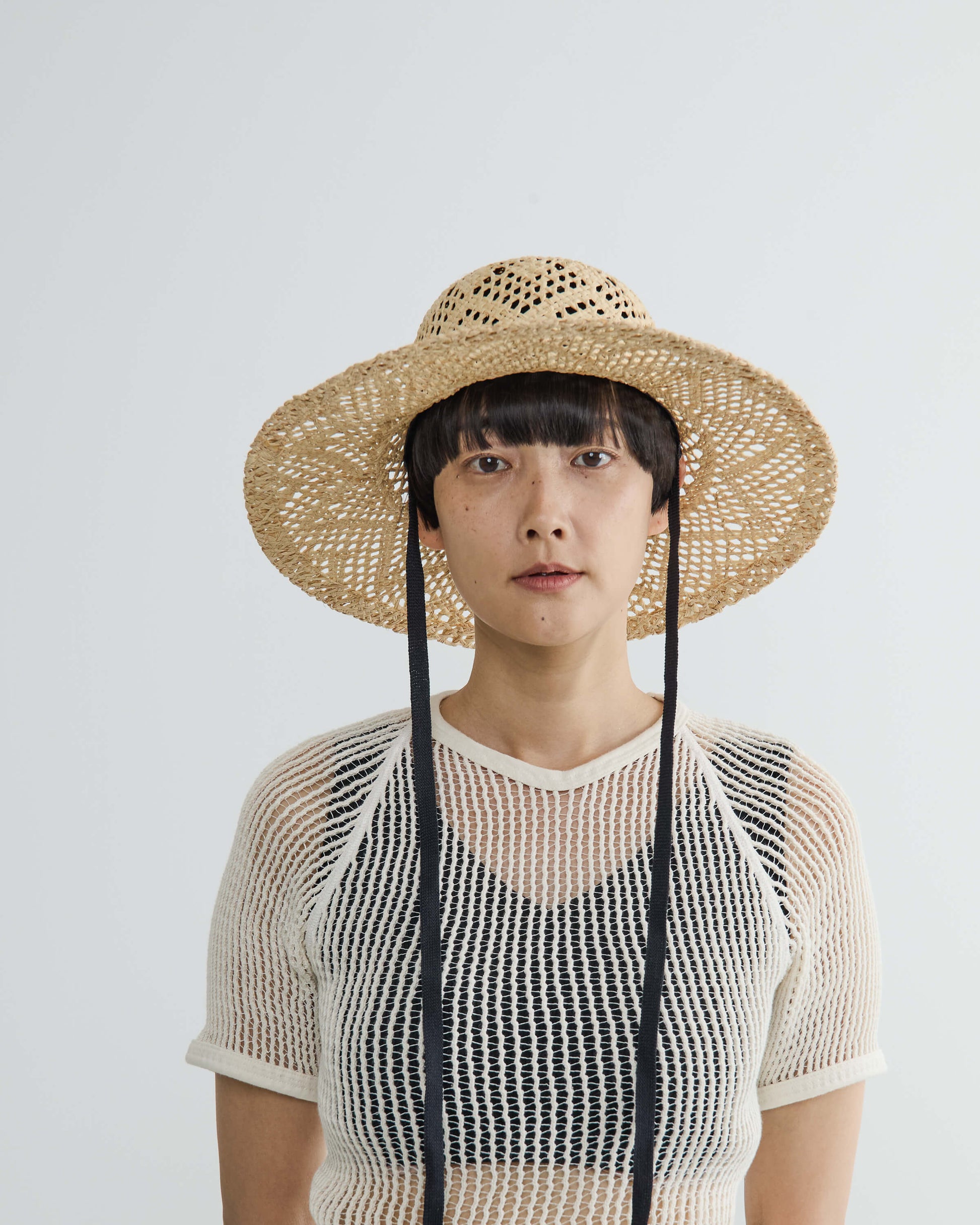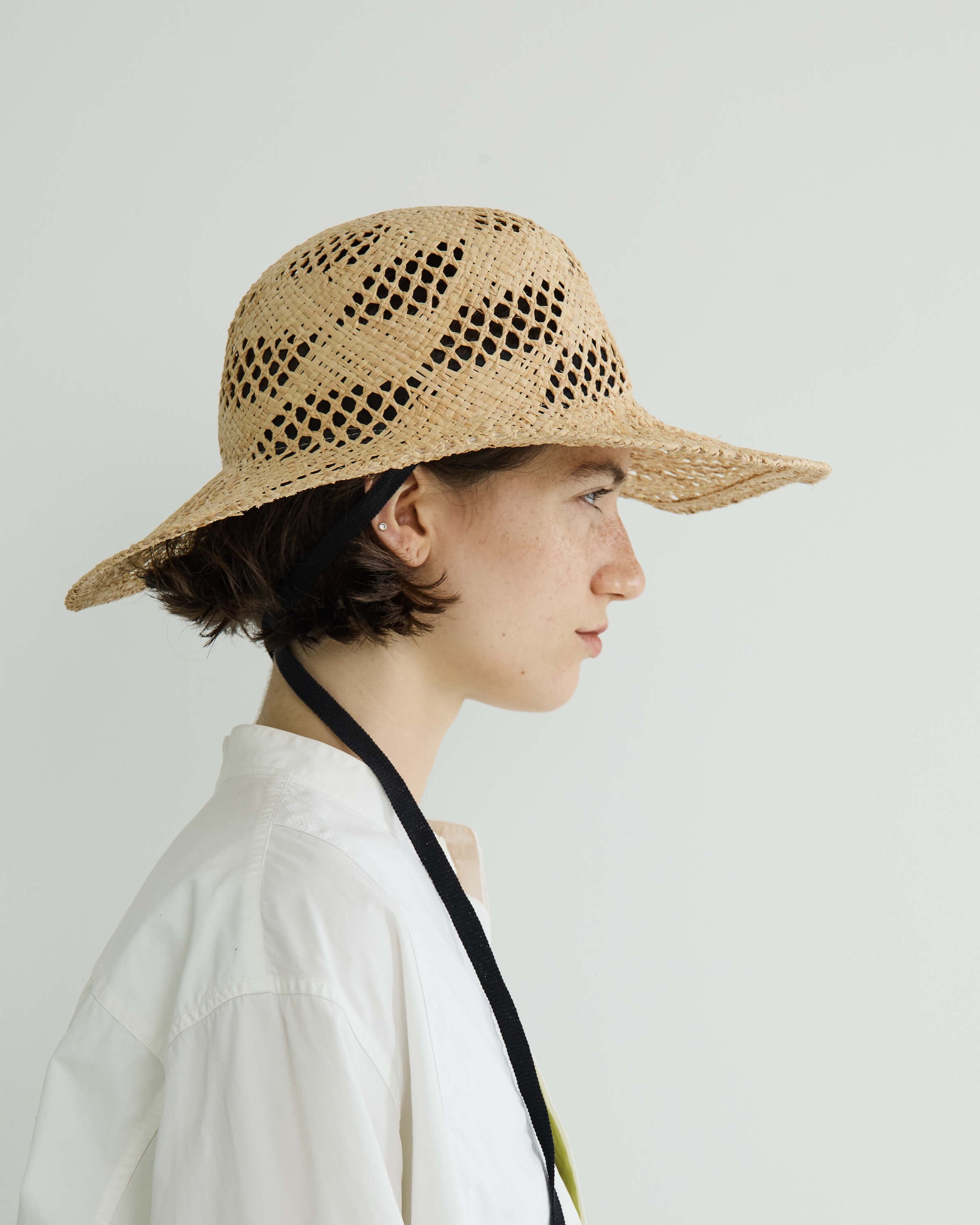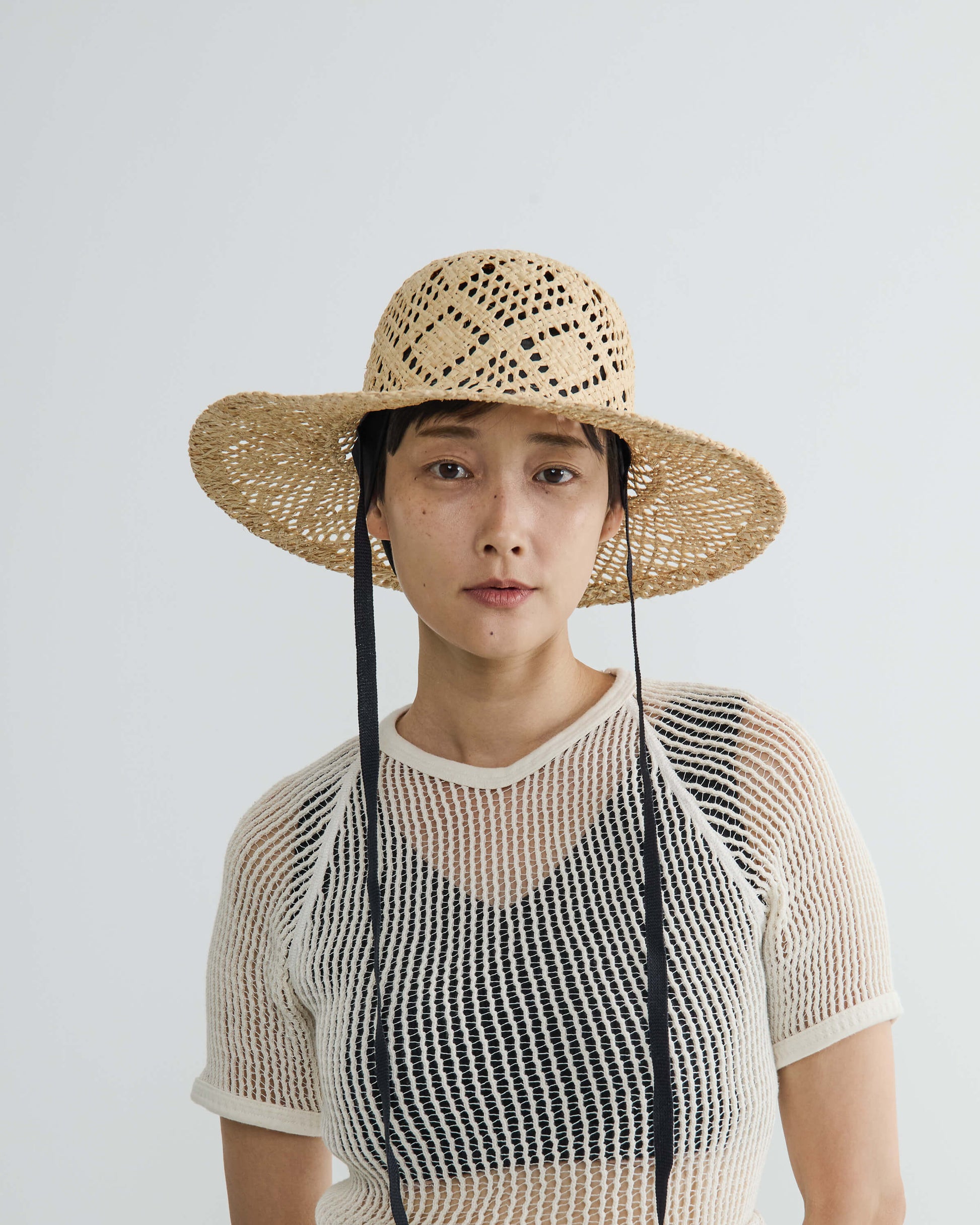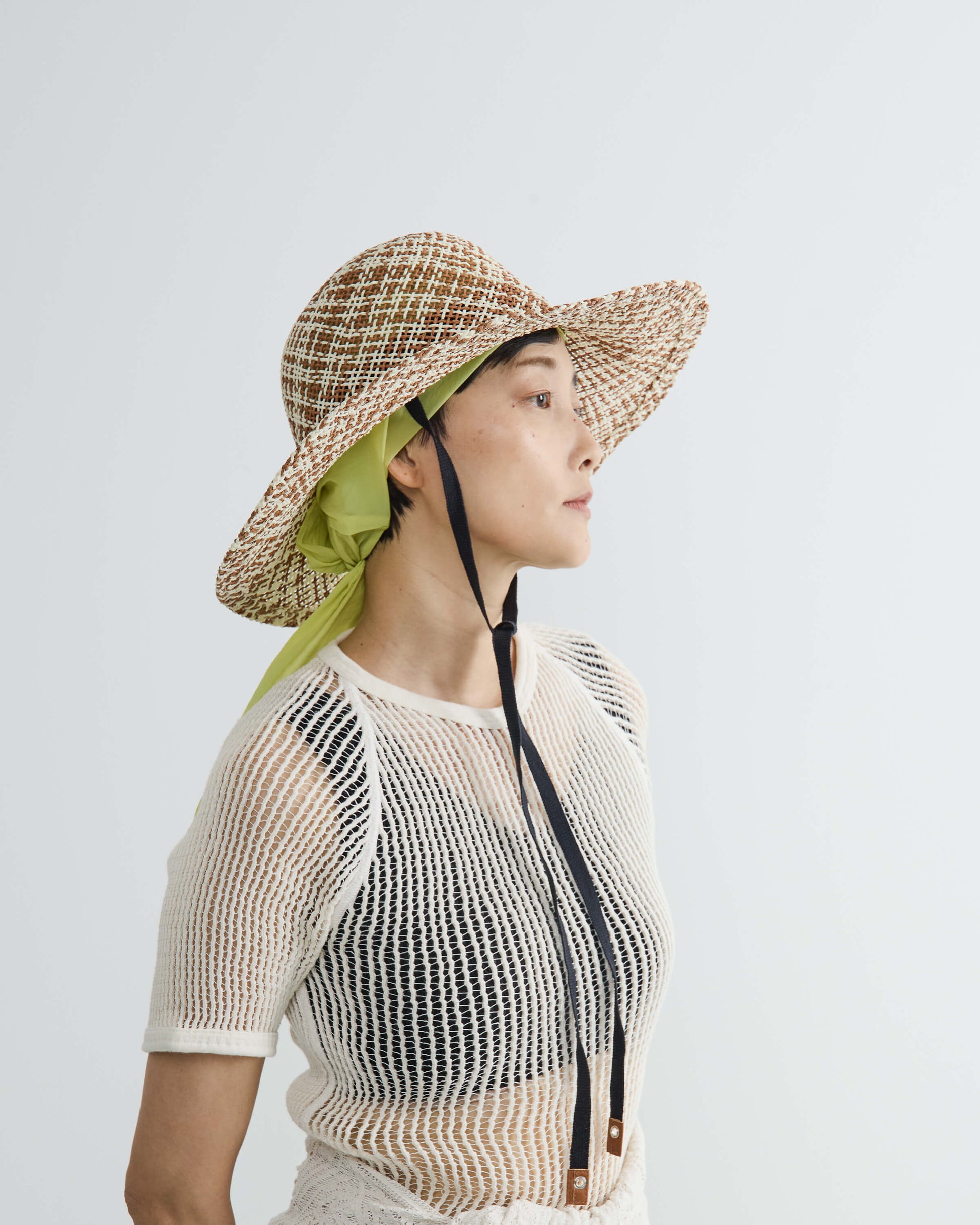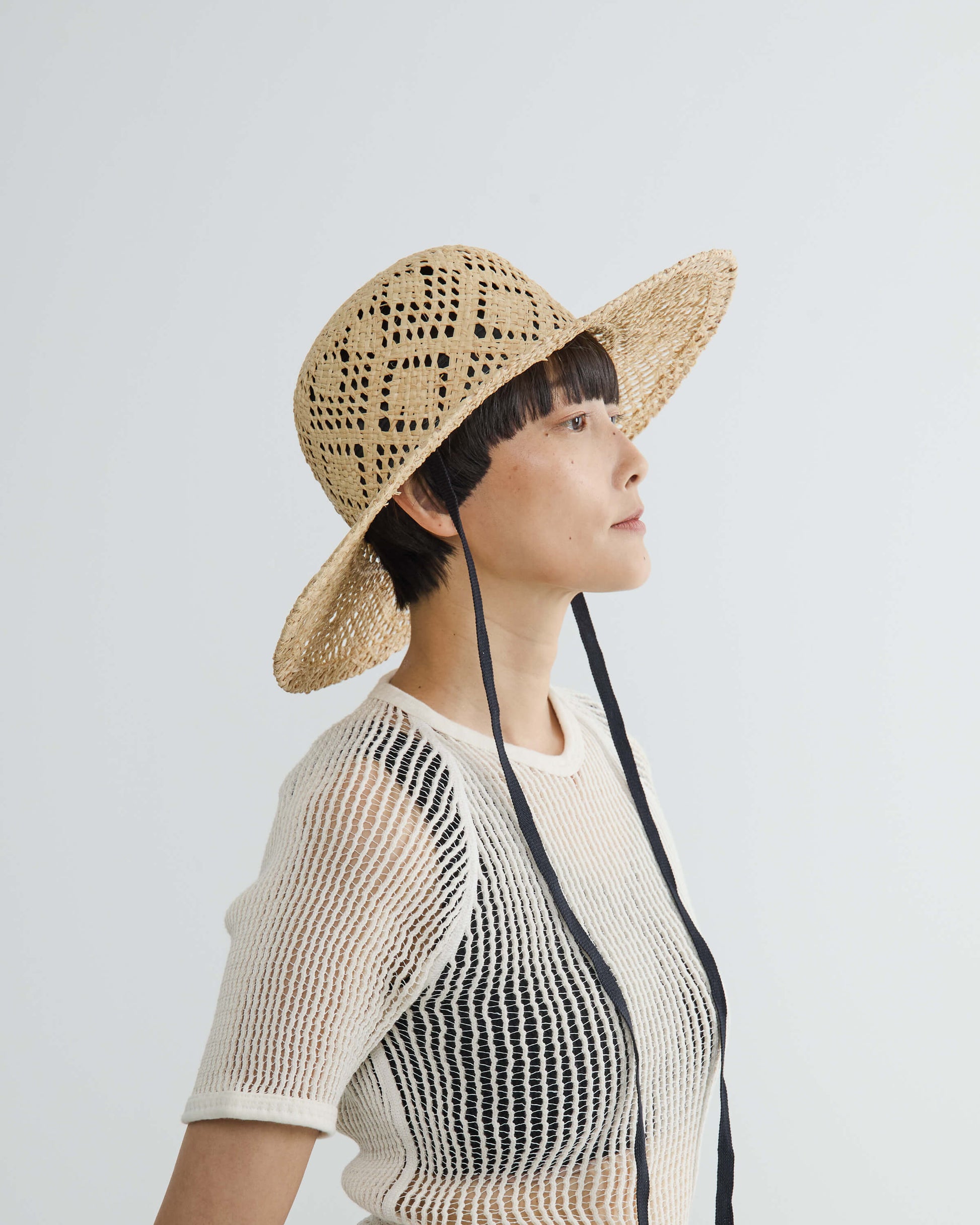 ブリムの長さとクラウンのバランスにこだわり、大げさにならない絶妙なボリューム感にまとめてリボン付きでポイントに。