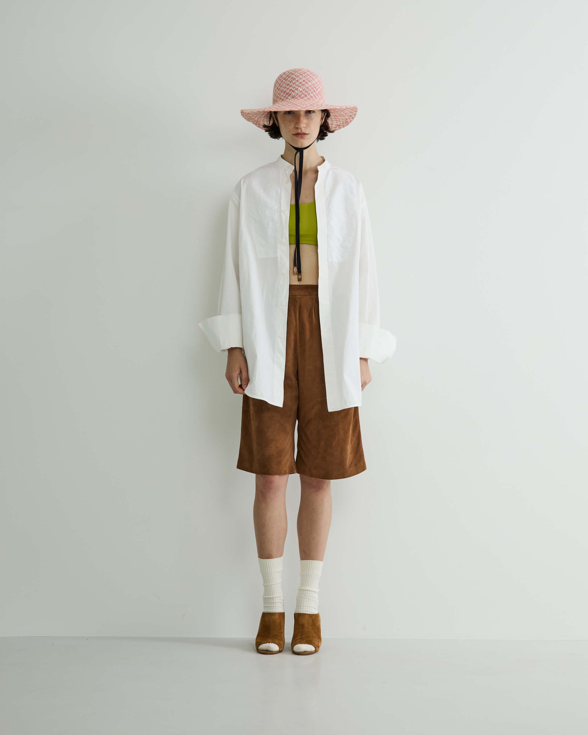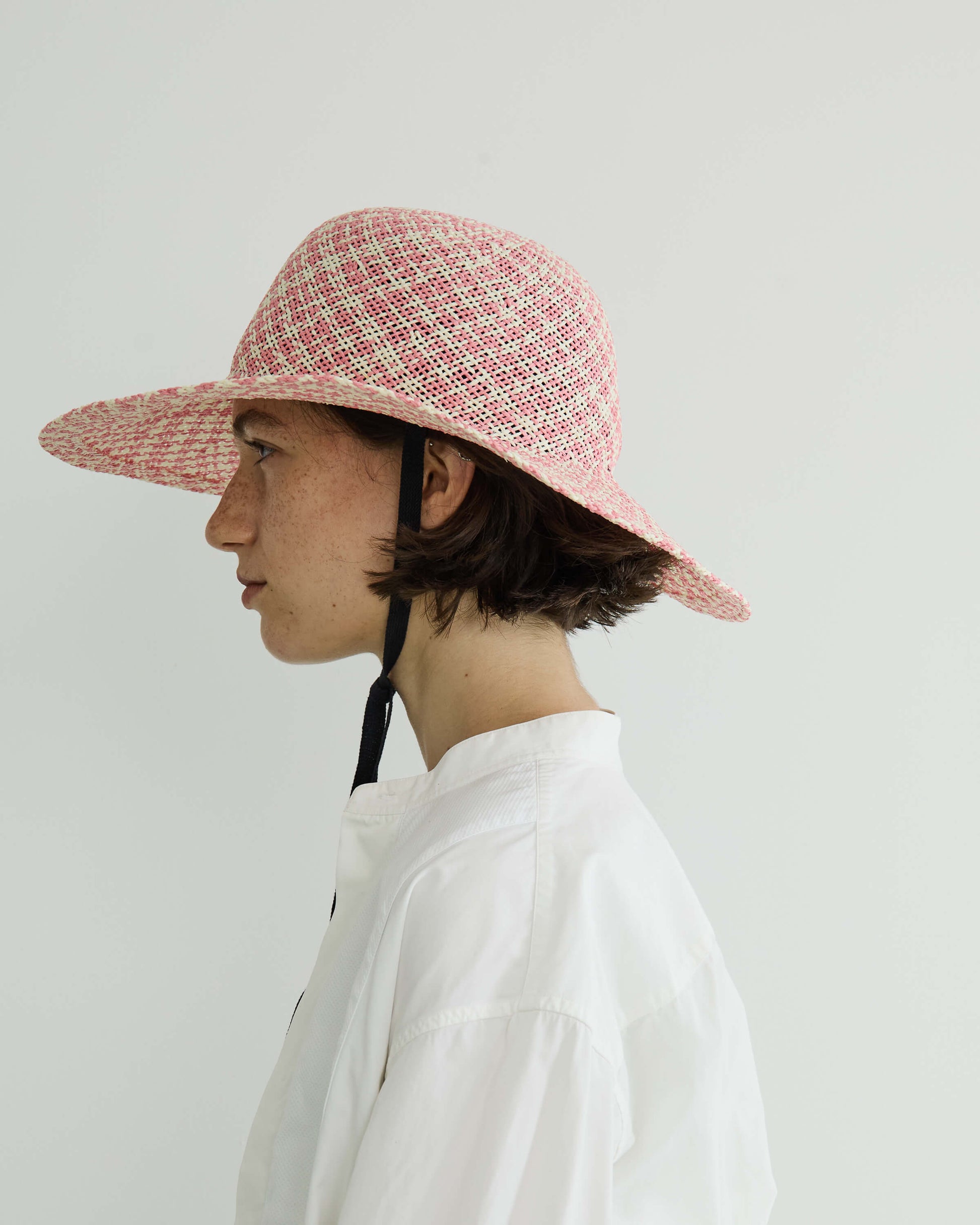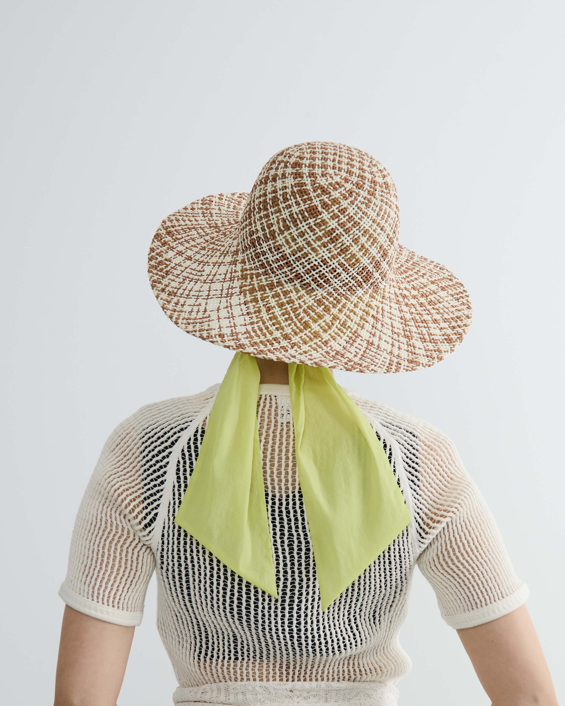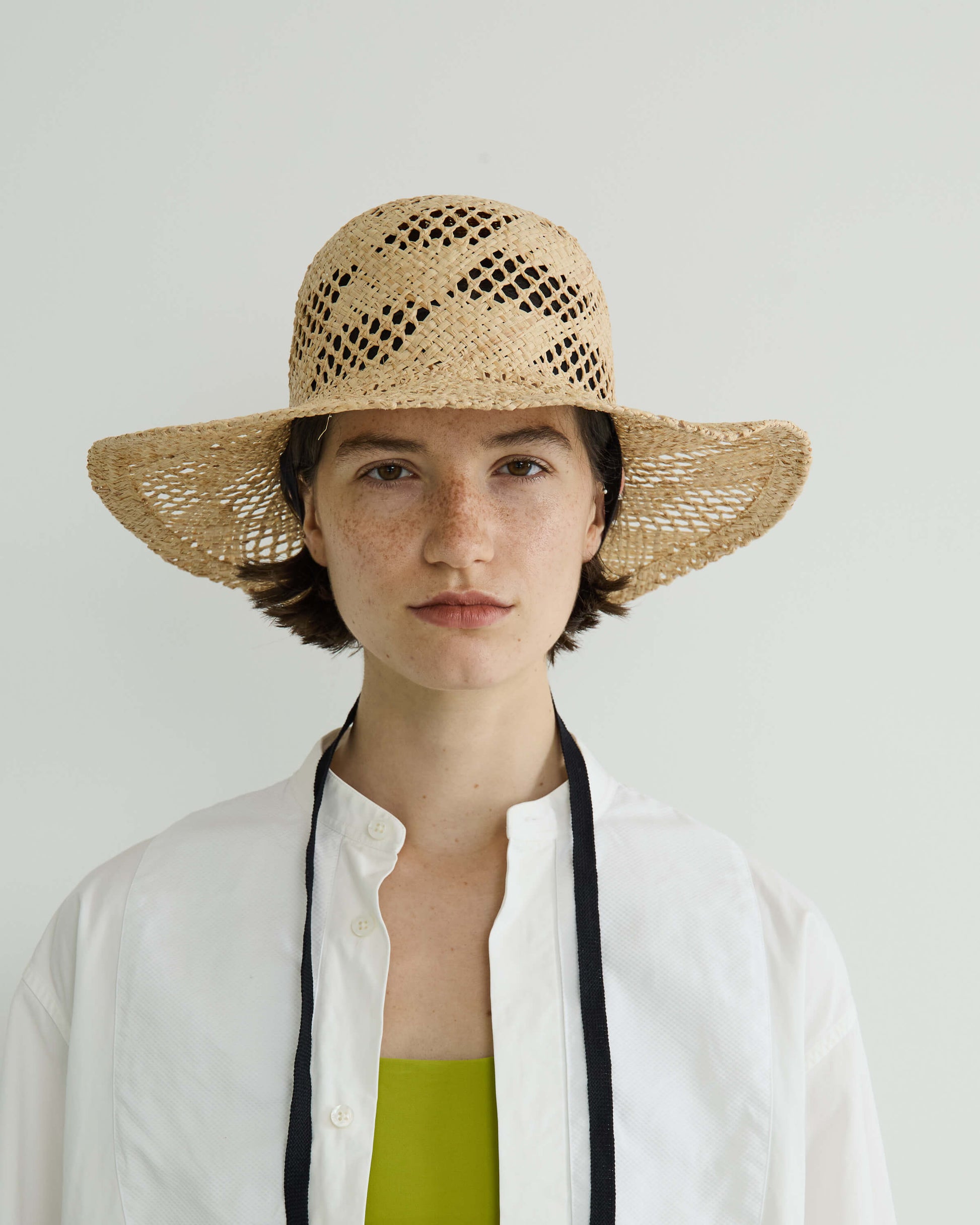 ブリムの長さとクラウンのバランスにこだわり、大げさにならない絶妙なボリューム感にまとめてリボン付きでポイントに。