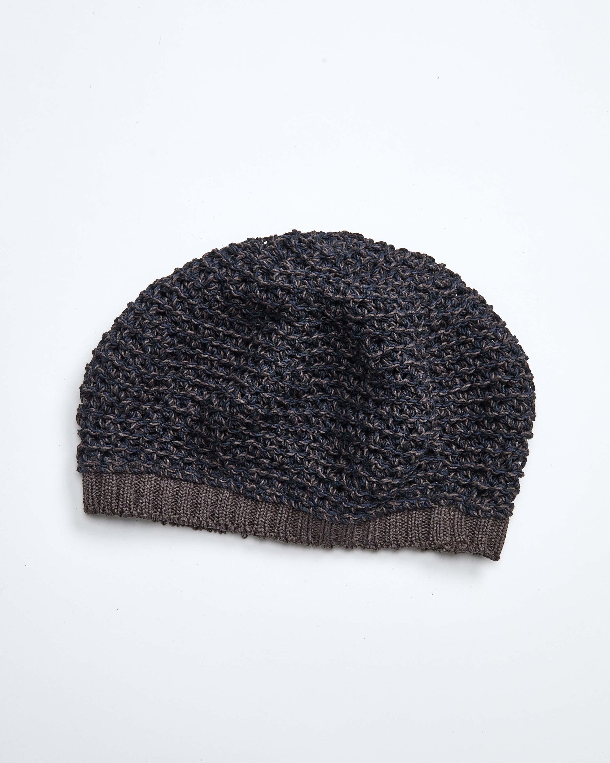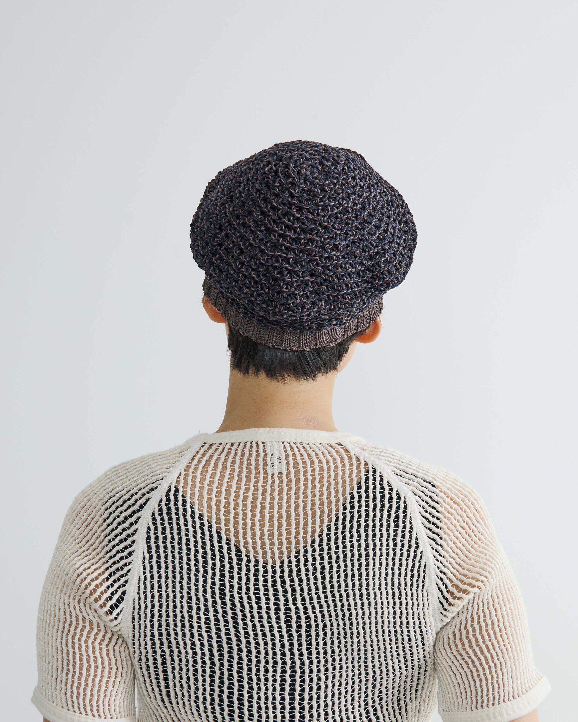 The natural material and hand-knit irregularity allow for a uniquely comfortable fit. Made by aligning 12 strands of linen-like cotton yarn, subtly mixed tones give the piece a three-dimensional, nuanced look.