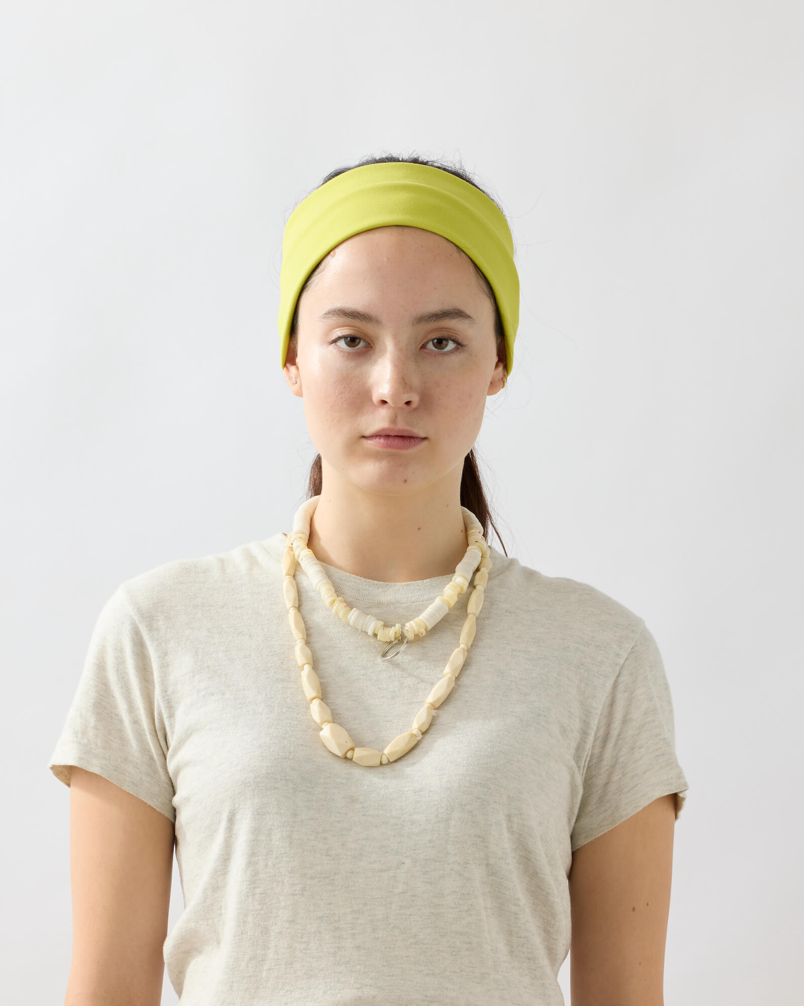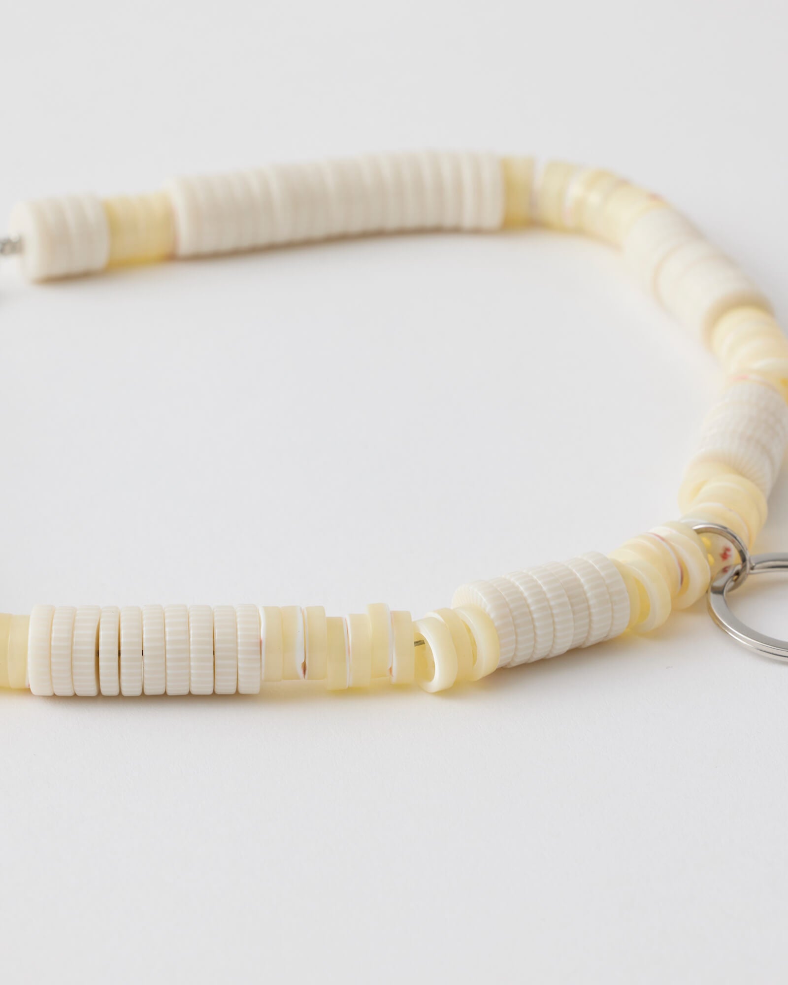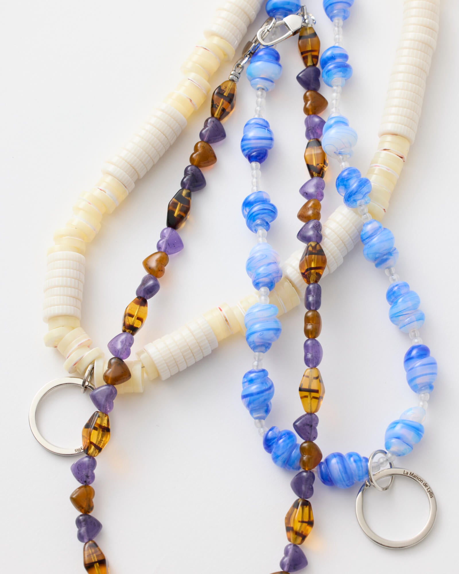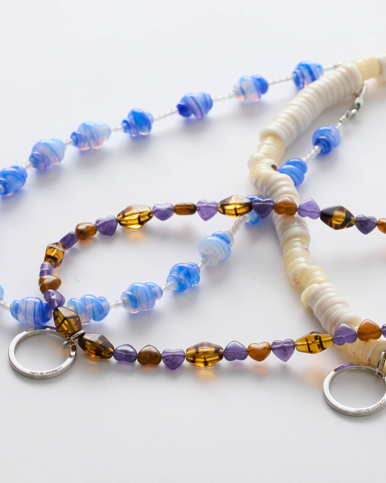 WHITE SHELL combines shell buttons with resin beads, while HEART incorporates vintage stock resin beads—both made from costume jewelry parts originally produced in Osaka in the 1970s–80s for export.