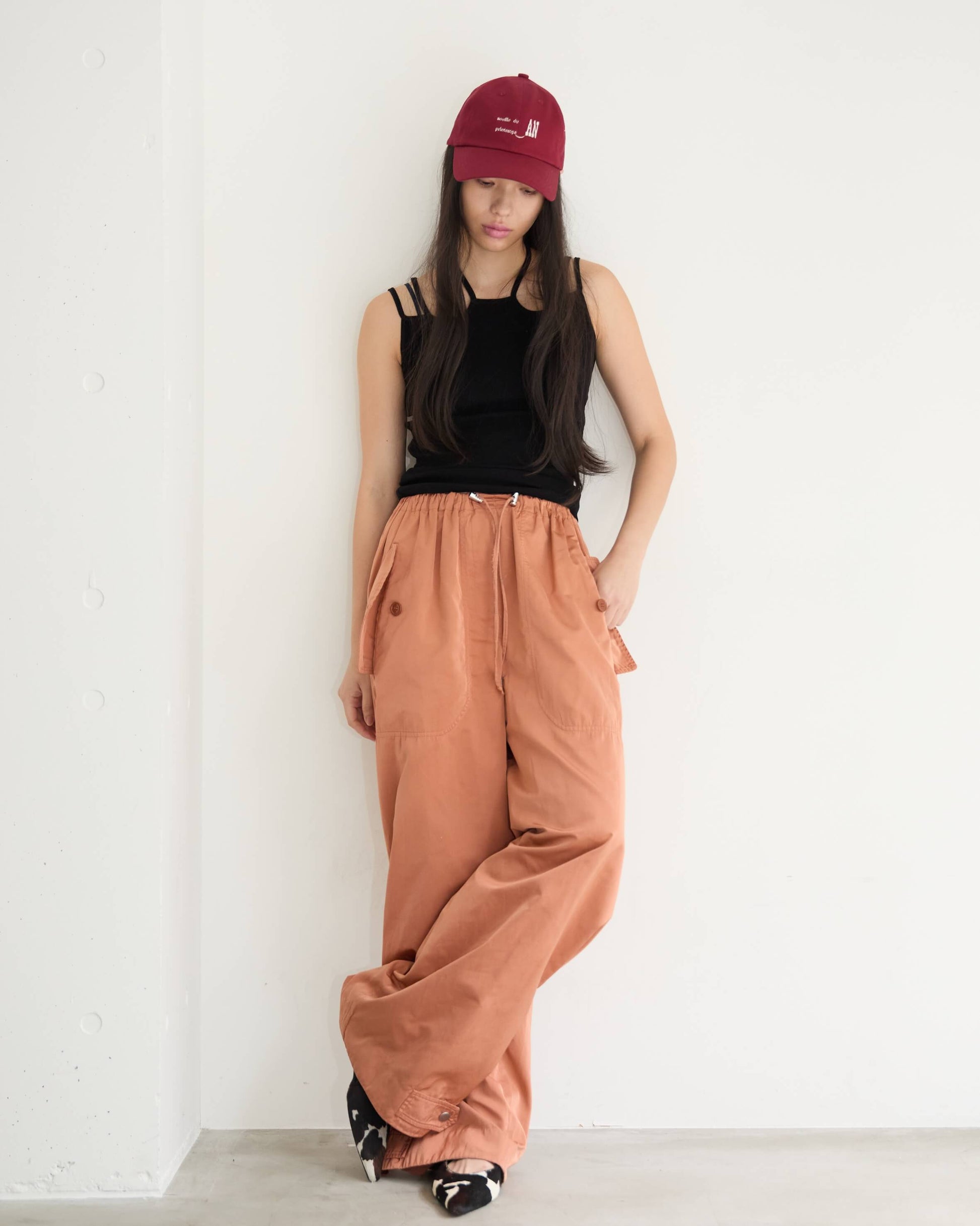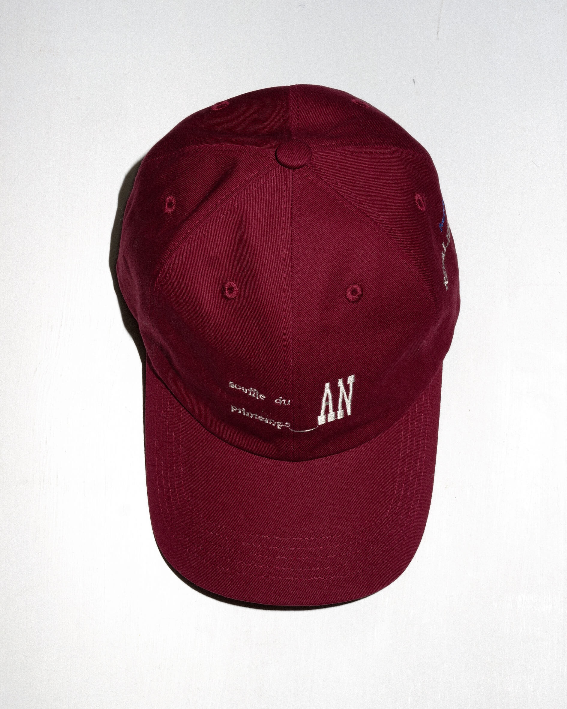 A cap featuring an embroidered logo created by extracting typography from a 1940s poetry book discovered at a second-hand book market we happened to pass by.