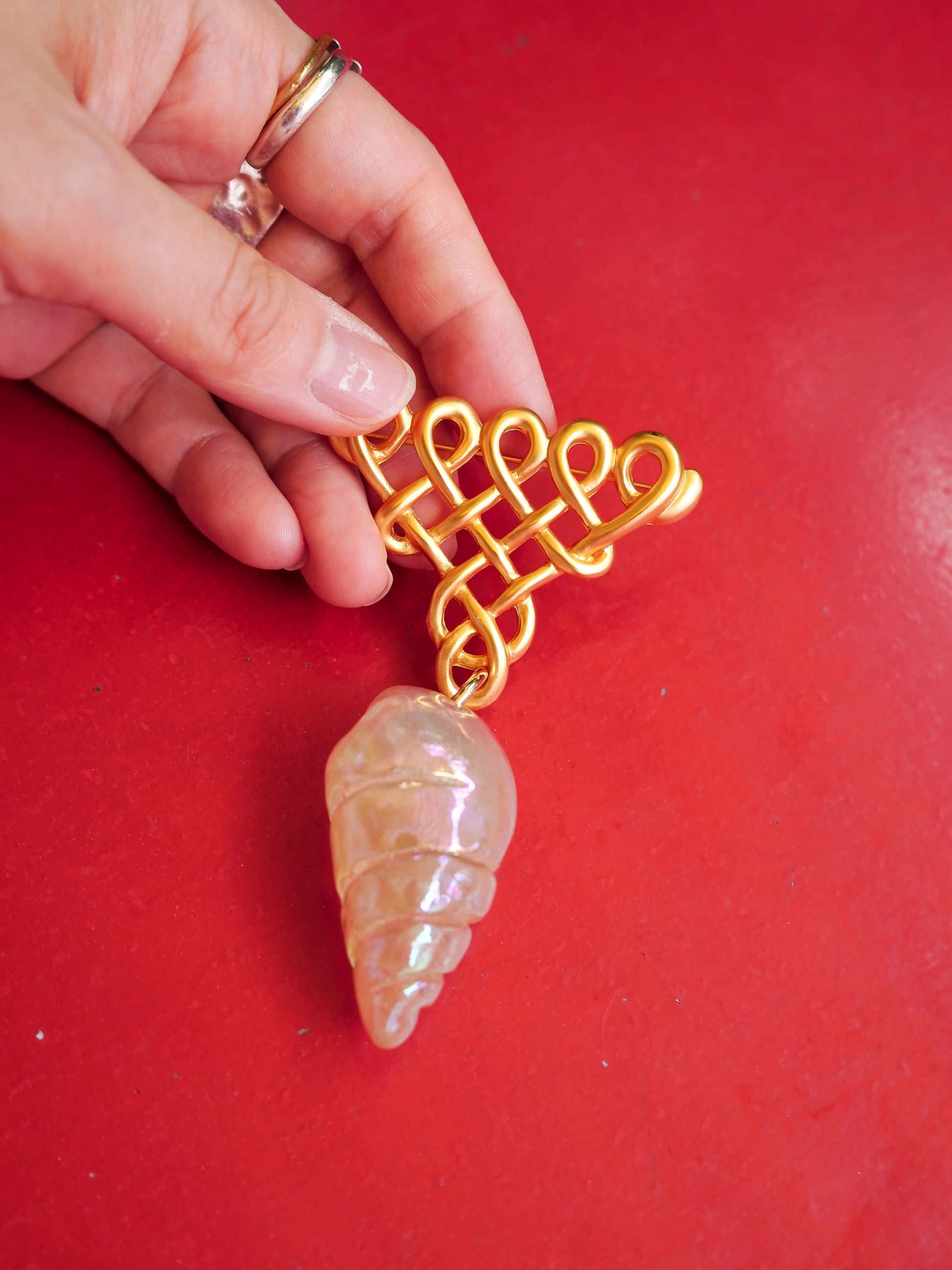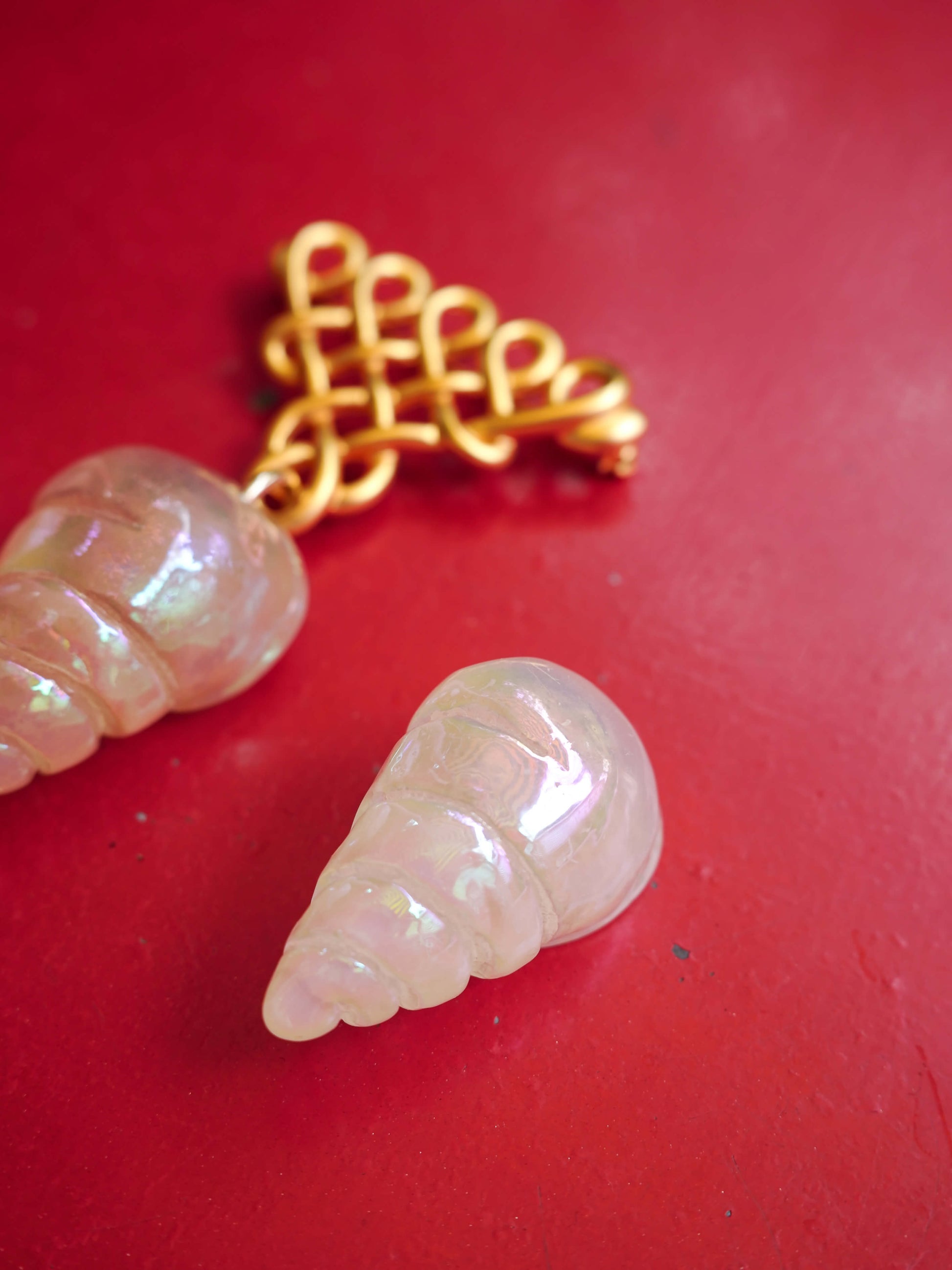 大ぶりなレジン製の貝モチーフを主役に、デッドストックパーツを組み合わせた存在感のあるブローチ。使用しているパーツは、コスチュームジュエリーが流行していた時代に、大阪で主に輸出用として生産されていたもの。今では手に入らない貴重なパーツを活かし、ノスタルジックで愛らしいデザインに仕上げました。