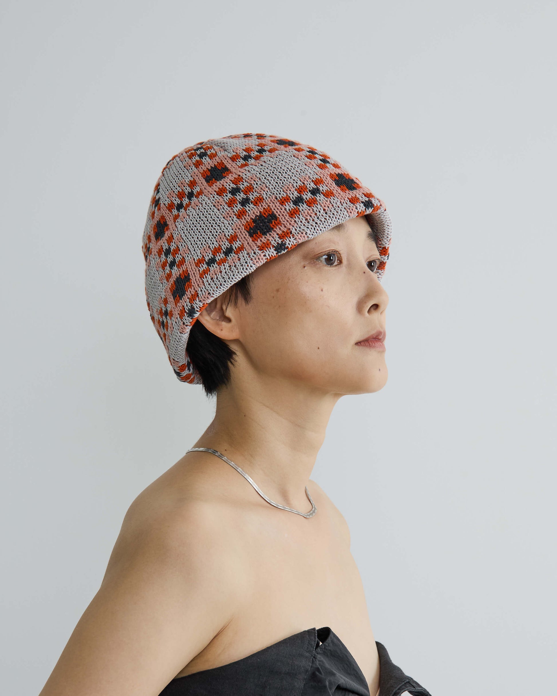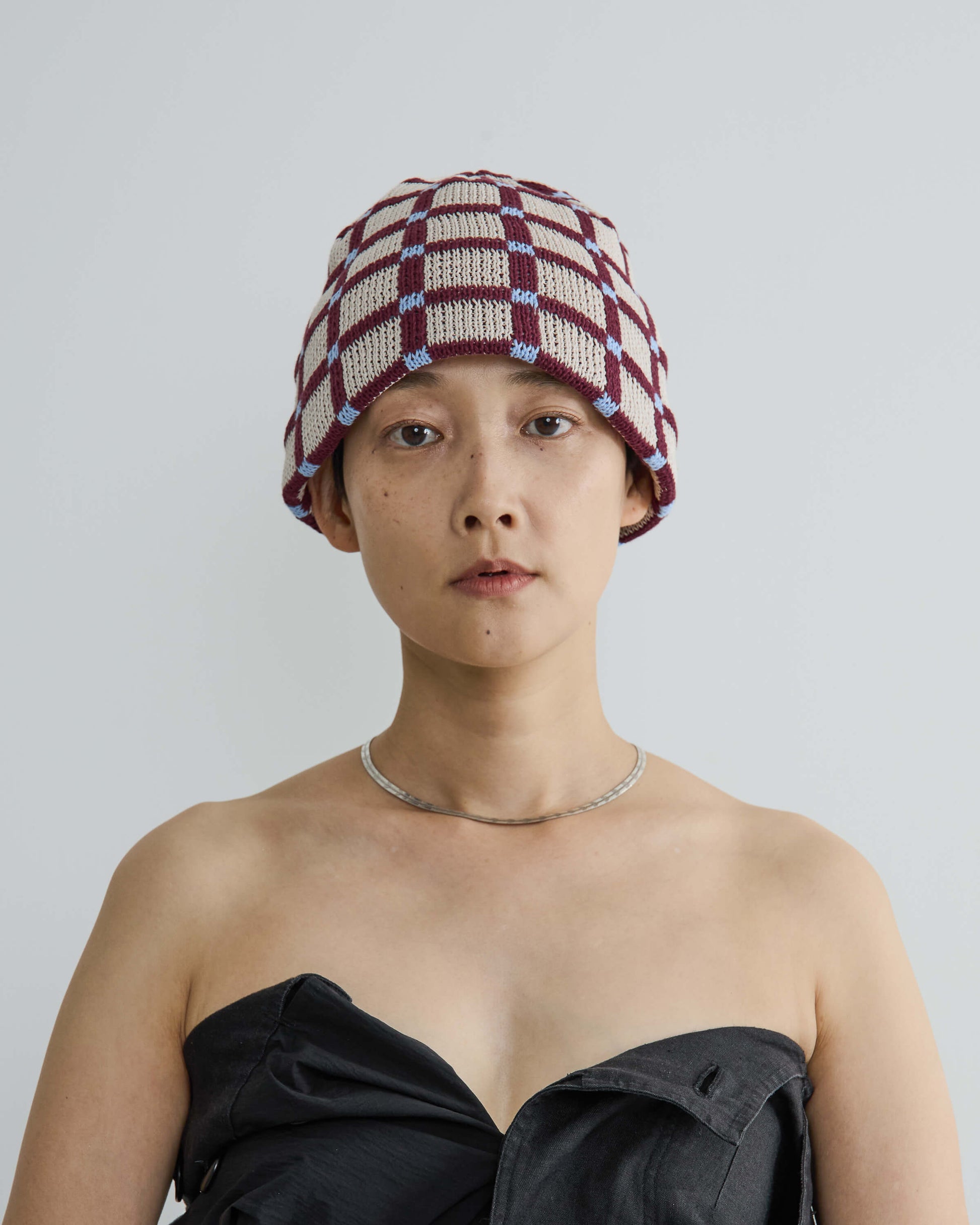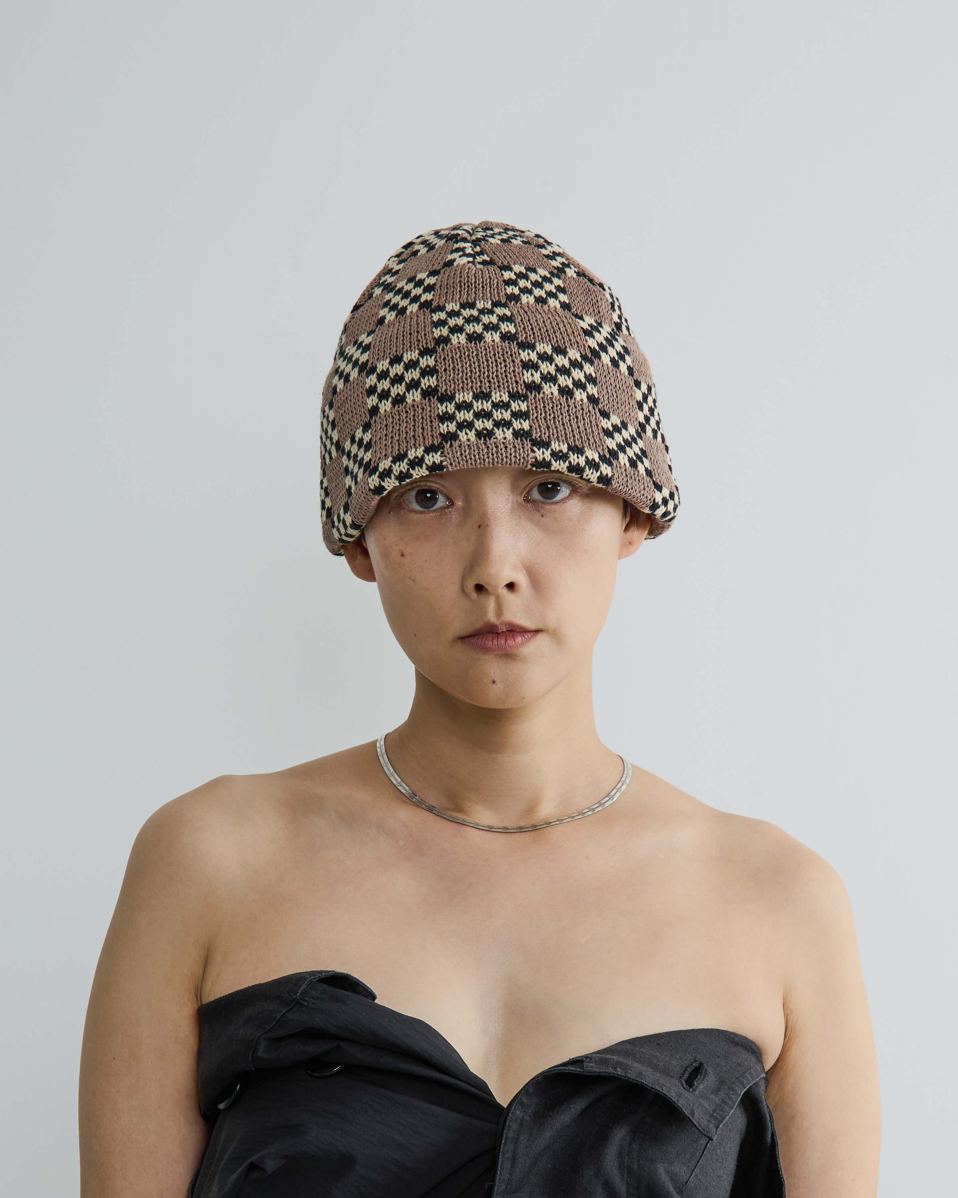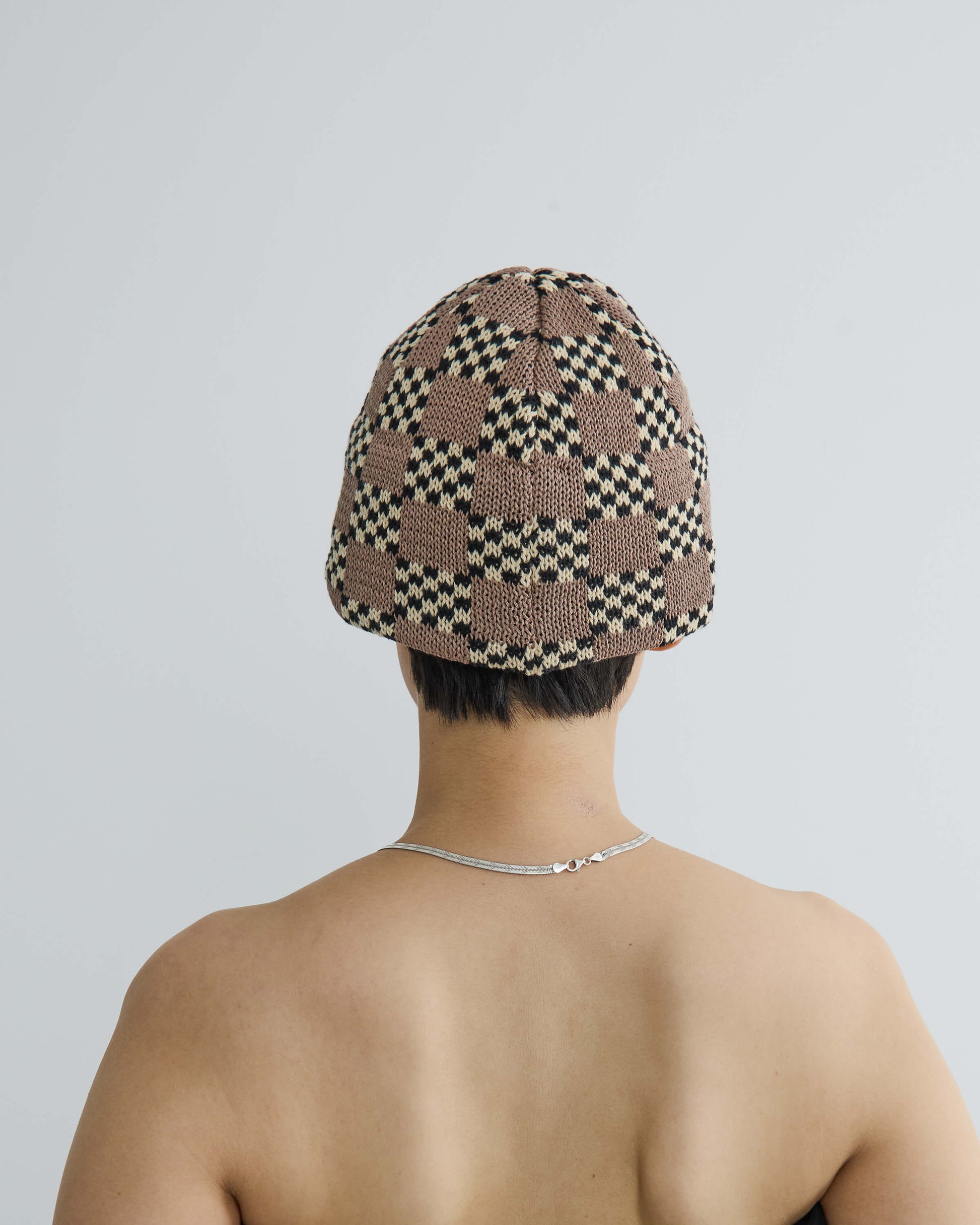 シルエットが特徴のニットビーニー。顔がすっぽりと埋まるような締め付けのないフォルムが印象的です。