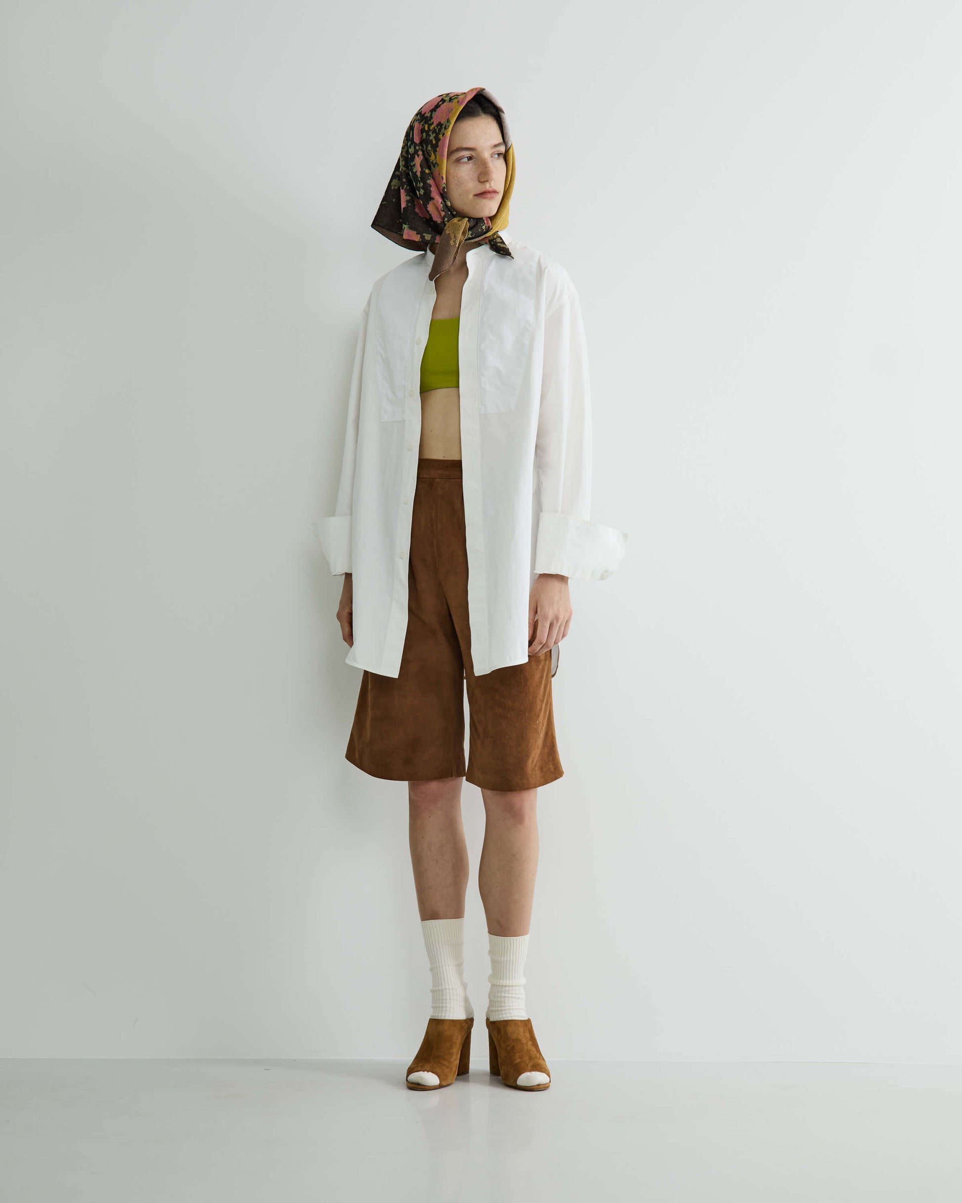 細番手のシルケットコットンで仕上げており、軽やかで柔らかく、いつまでも触っていたくなるような優しい肌触りが魅力です。三角に折る位置によって絵柄の見て方が変わり、スタイリングの幅も広がります。季節を問わず使えるシーズンレスなアイテムです。