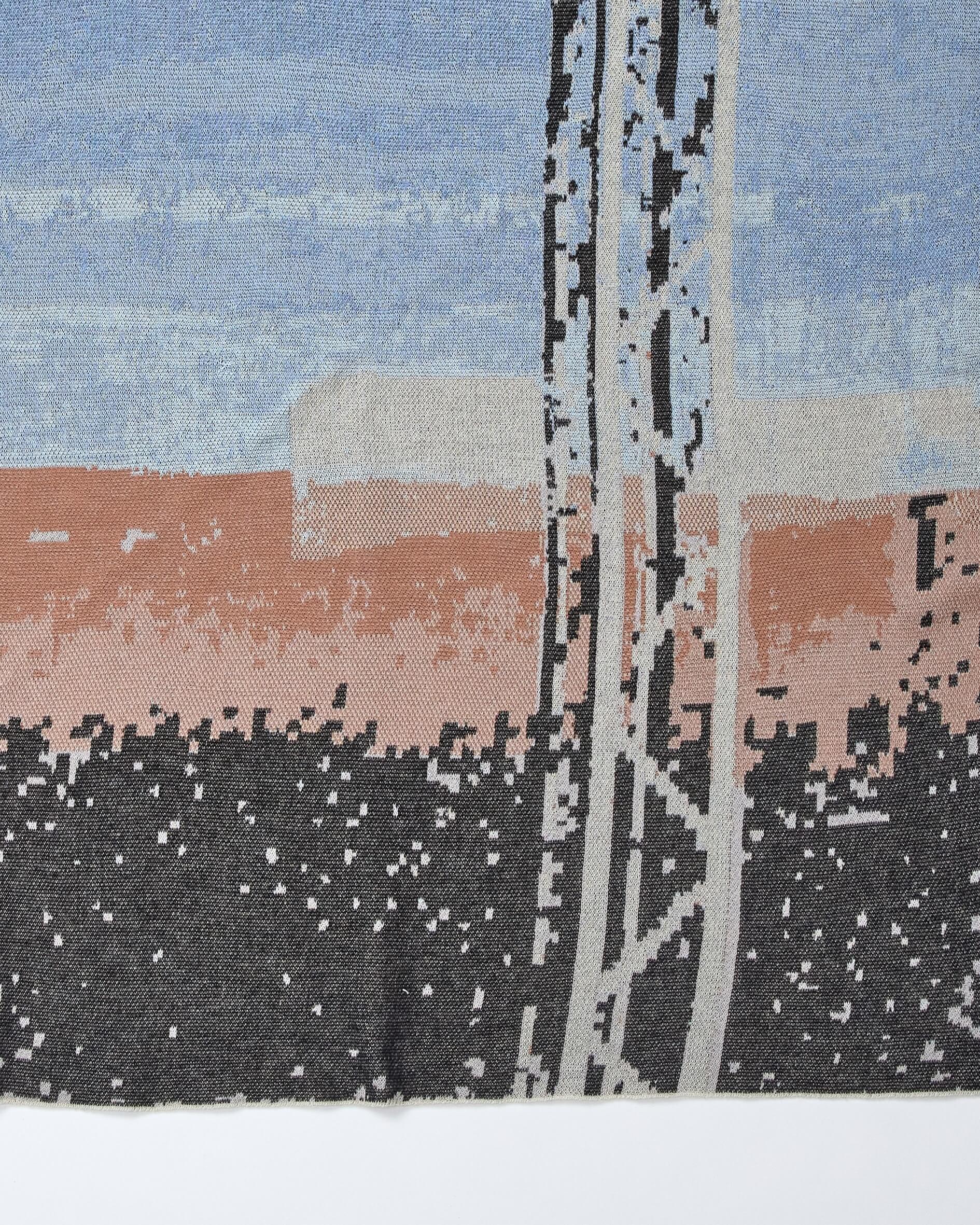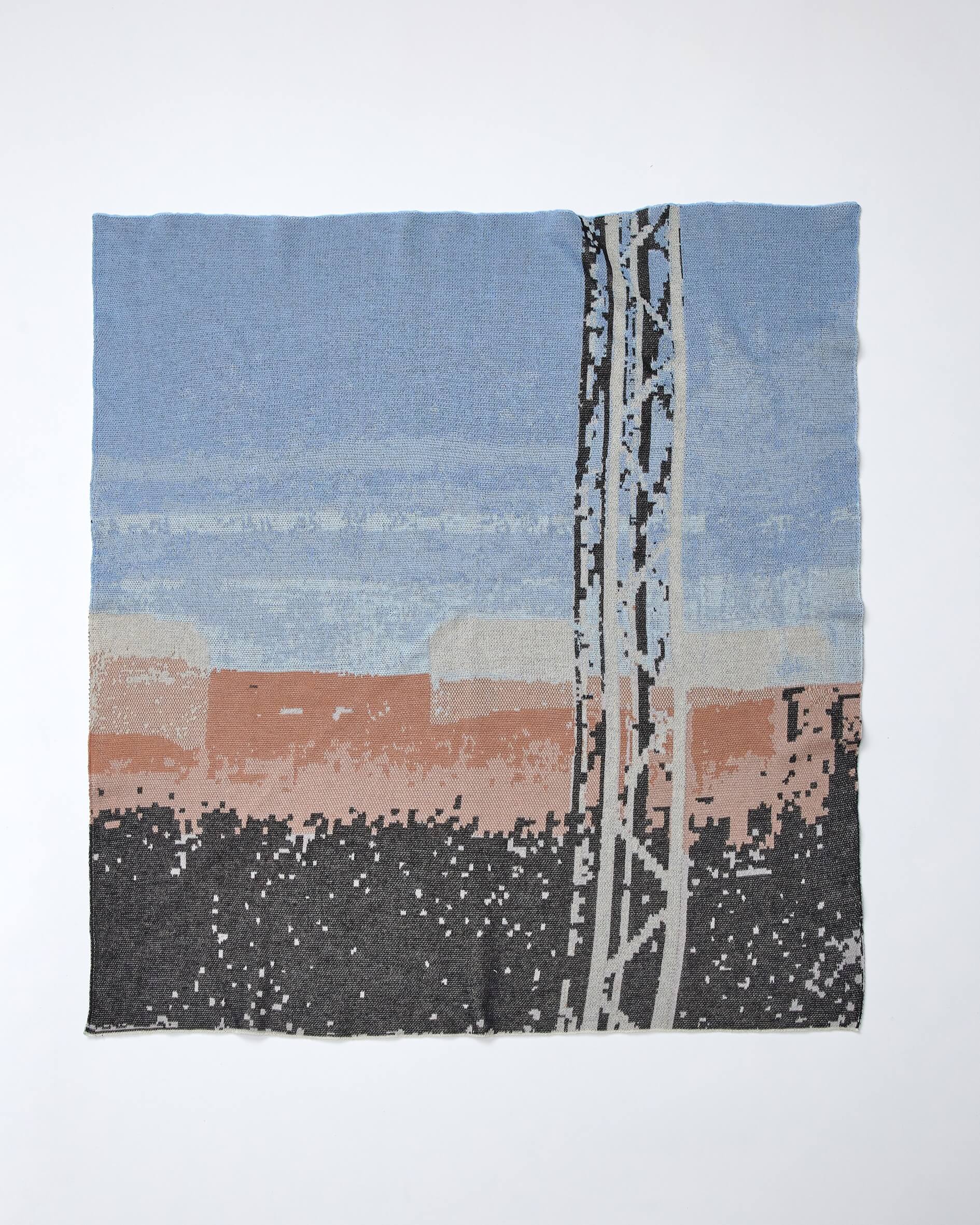 A large-format scarf knitted in double jacquard, featuring a mosaic artwork created from nostalgic travel photographs.