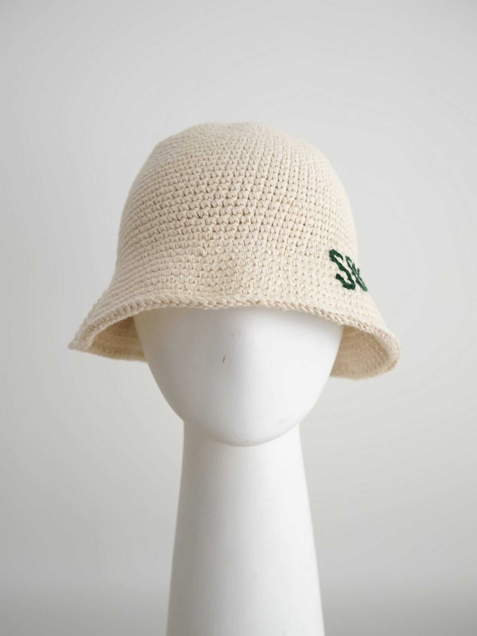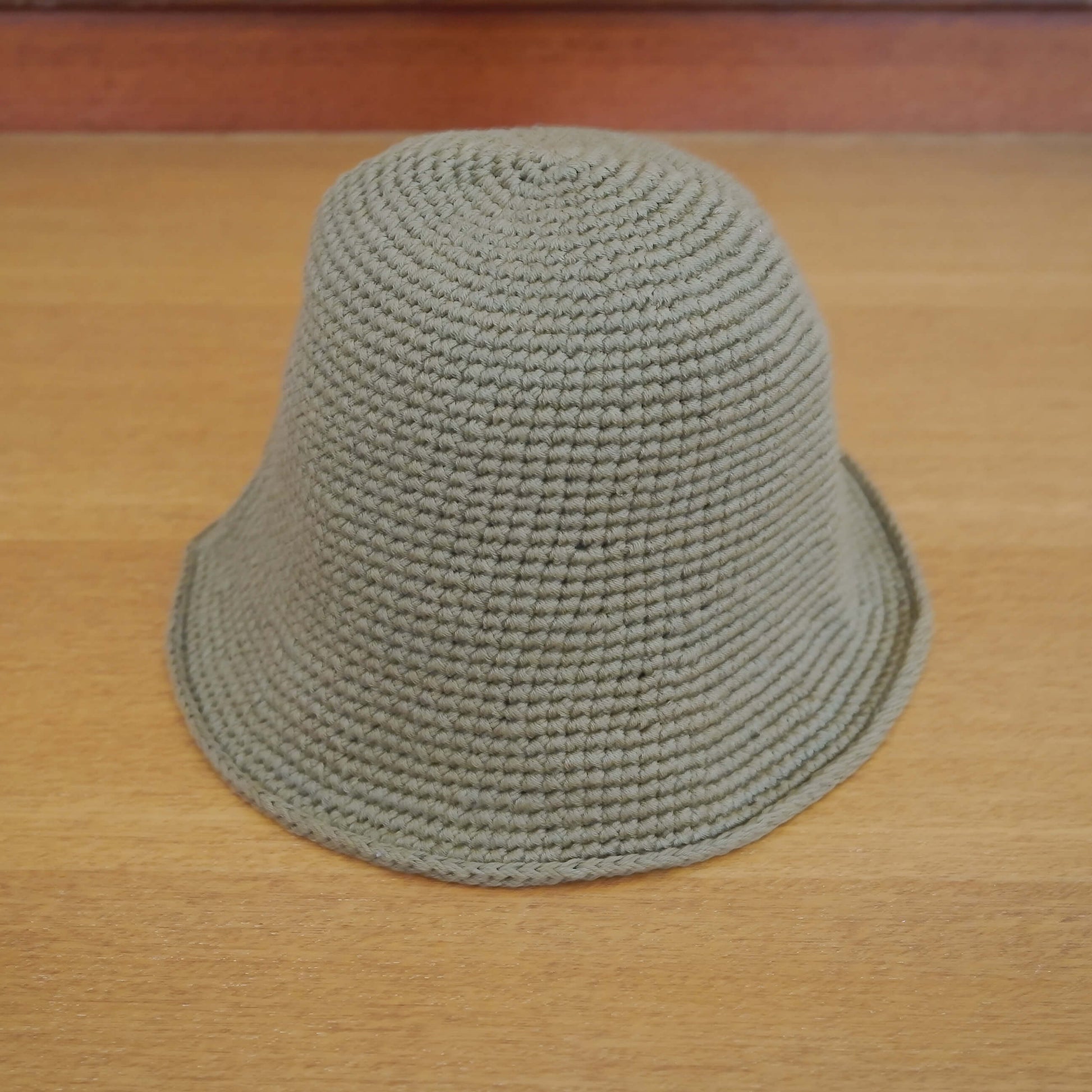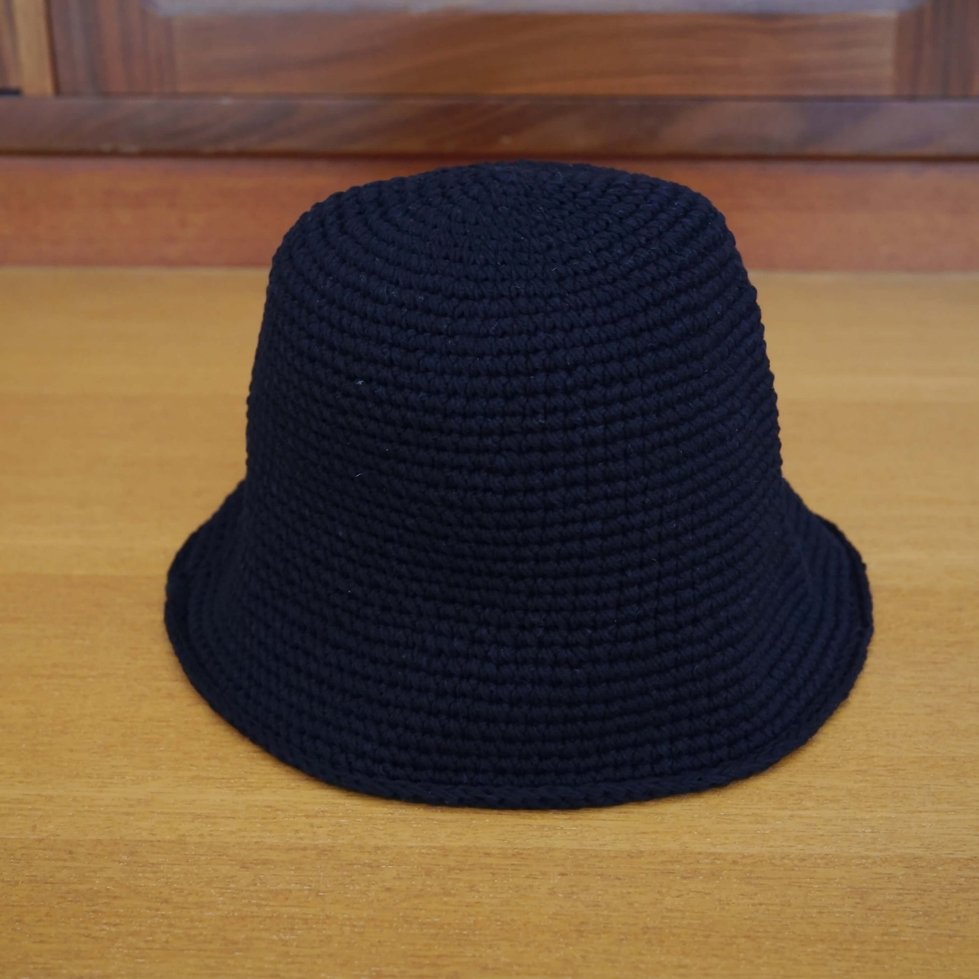 A hand-crocheted bucket hat crafted from cotton yarn with a texture reminiscent of traditional kite string. Its compact silhouette offers a snug yet relaxed fit, and the hat is designed without an inner size tape, allowing for a comfortable one-size fit.
