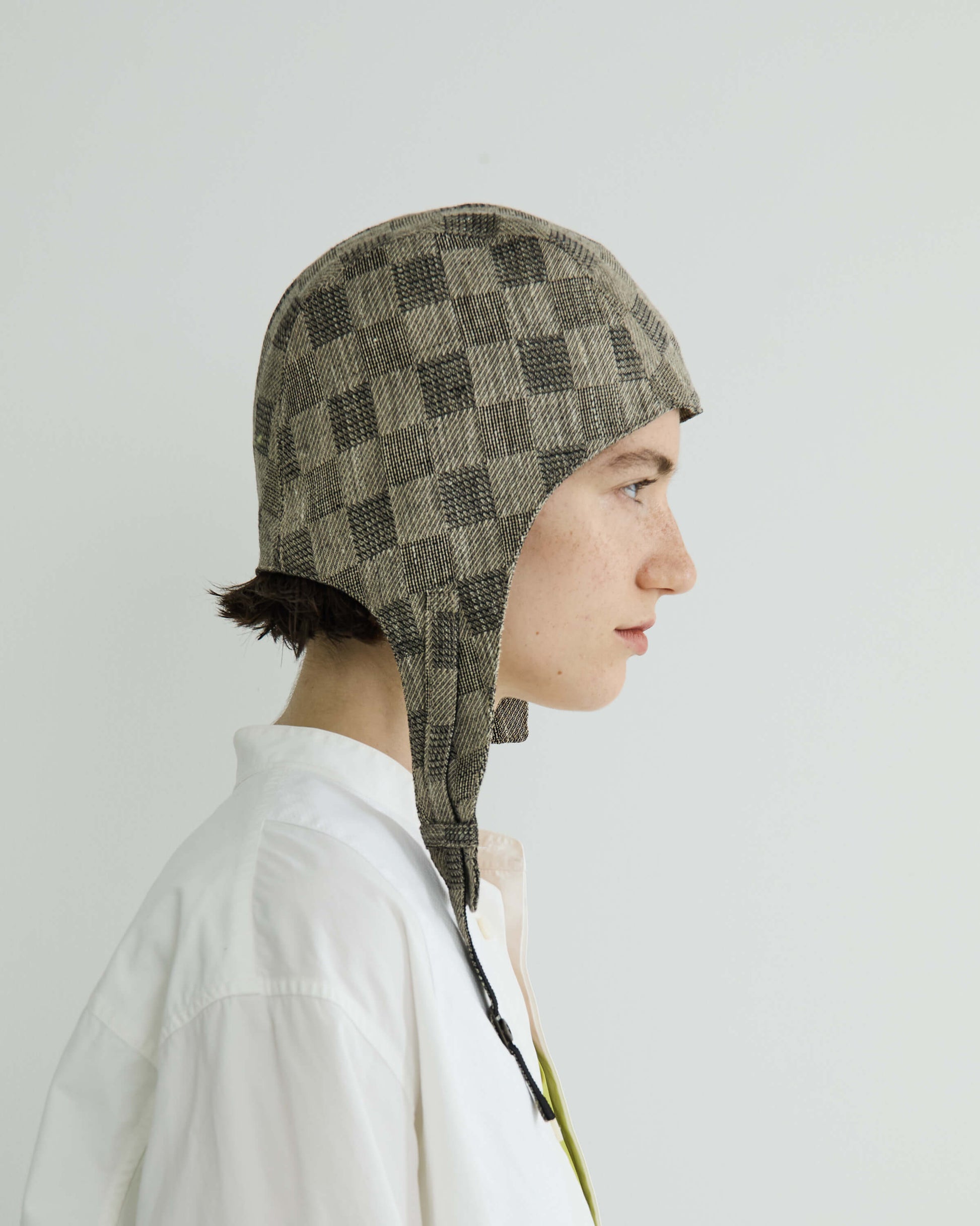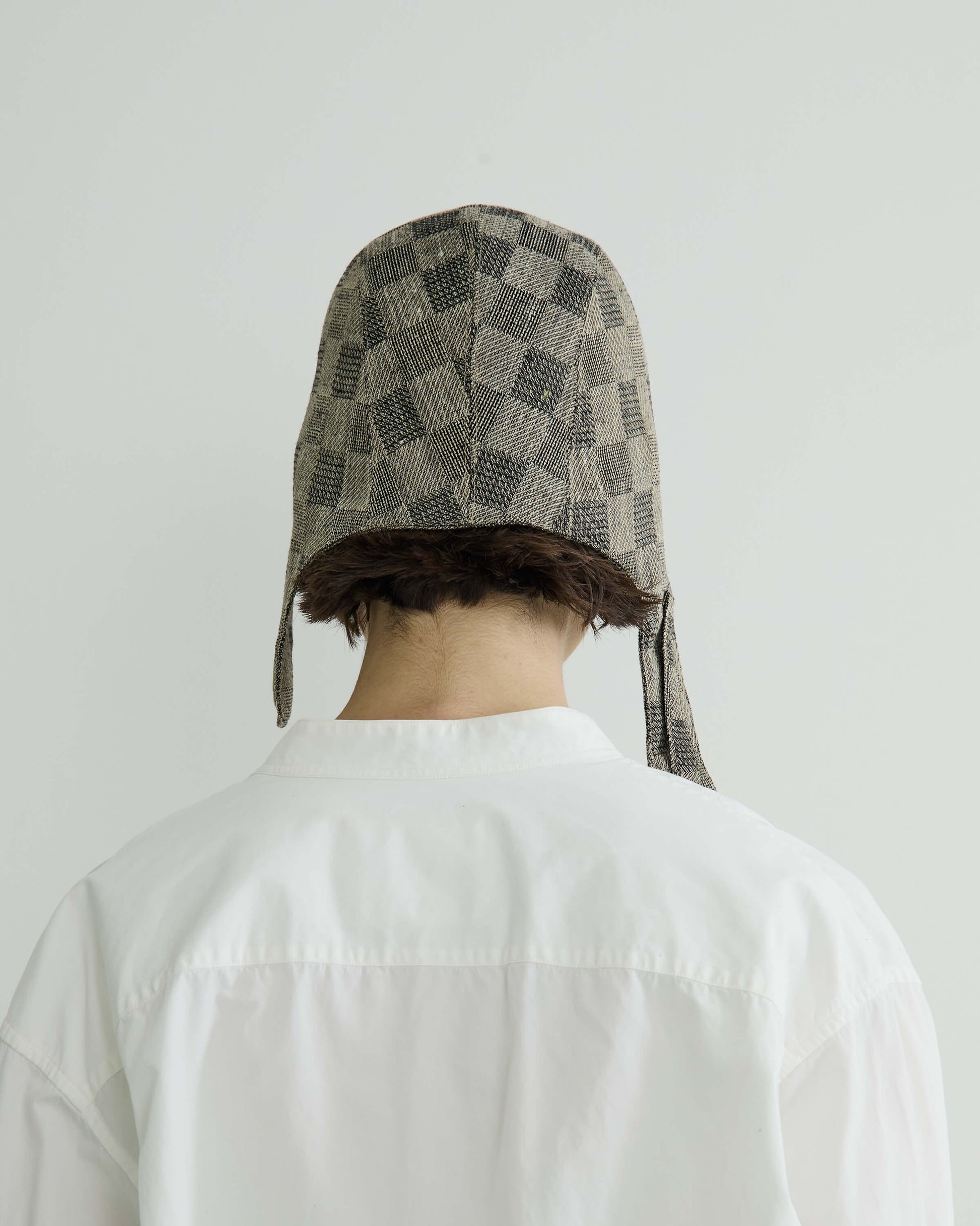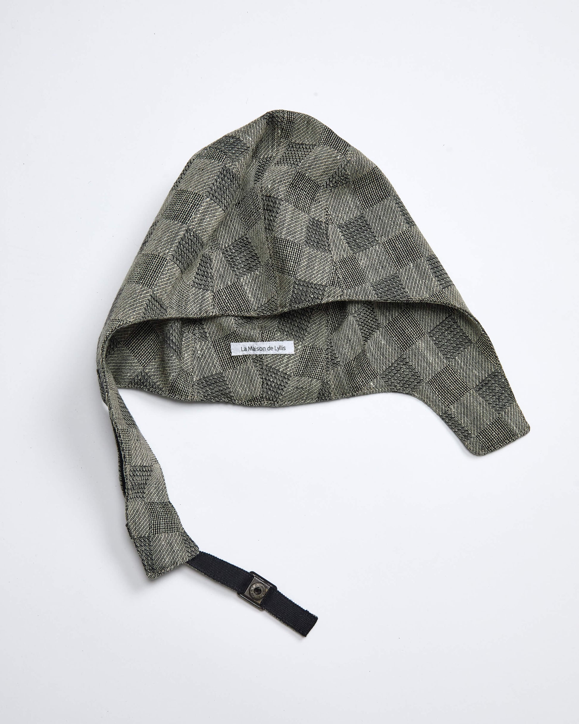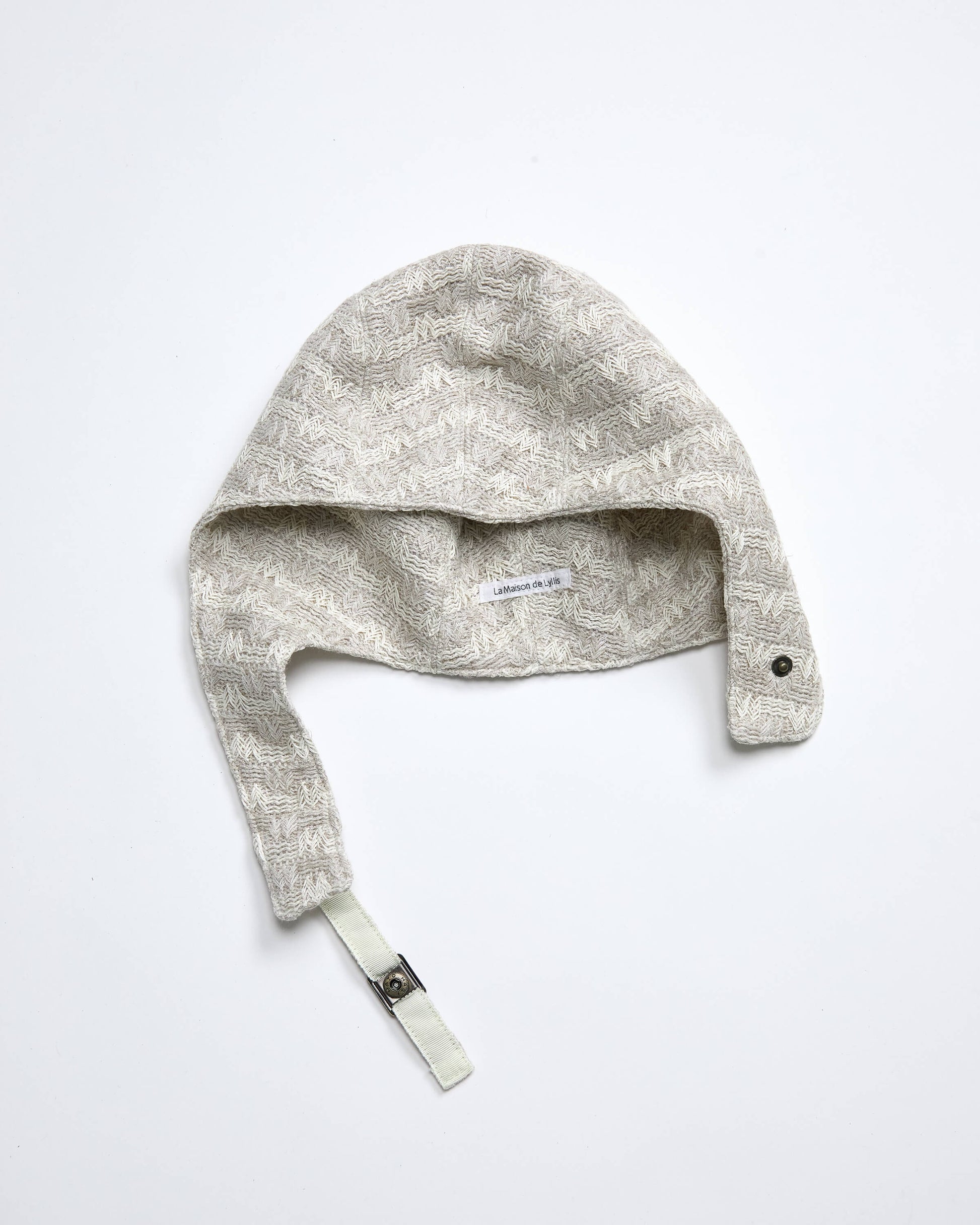 風を避け、ヘアスタイルと合わせてアクセサリーとしても楽しめるフード。デザインソースは中央アジアの遊牧民から。